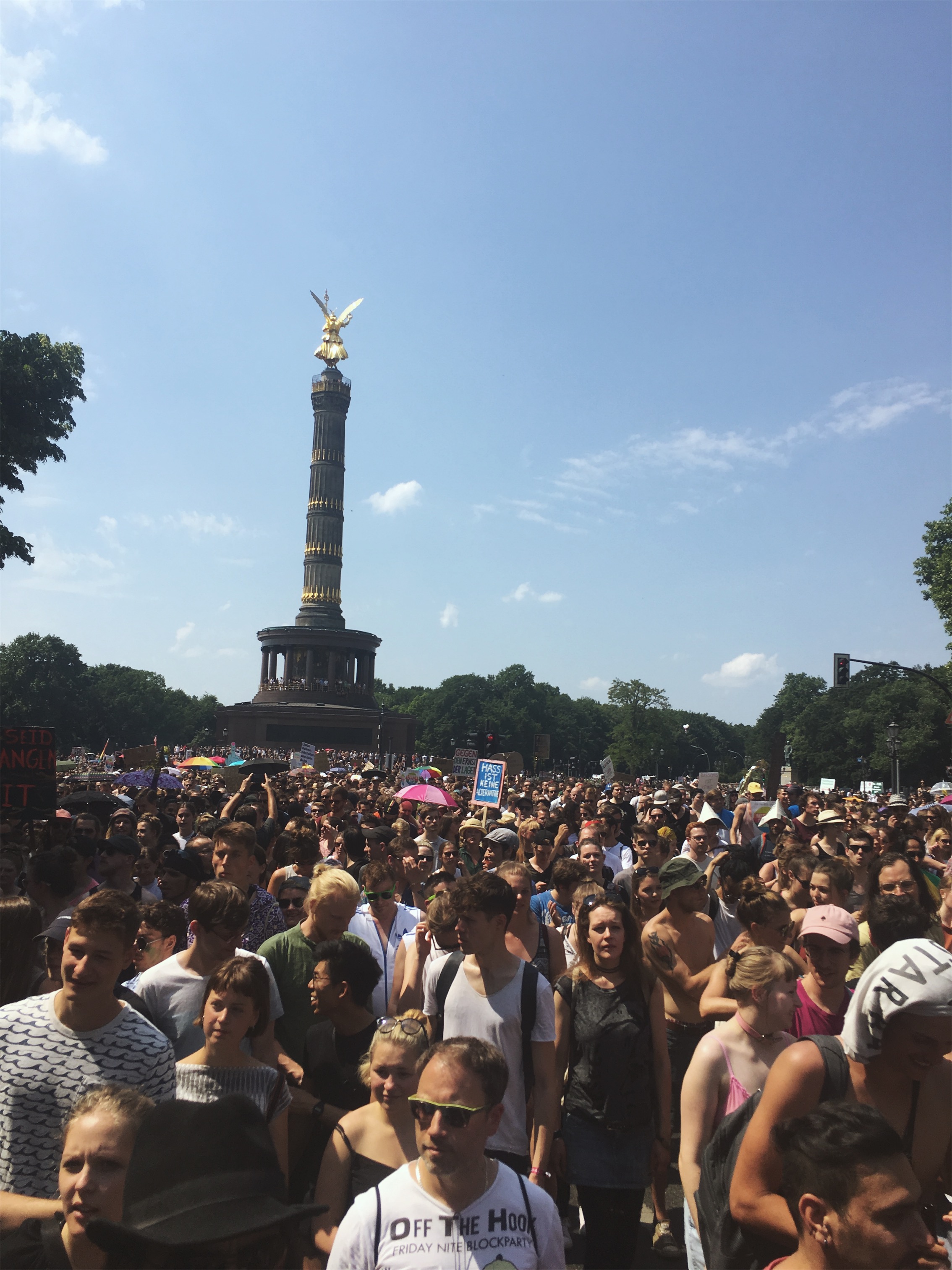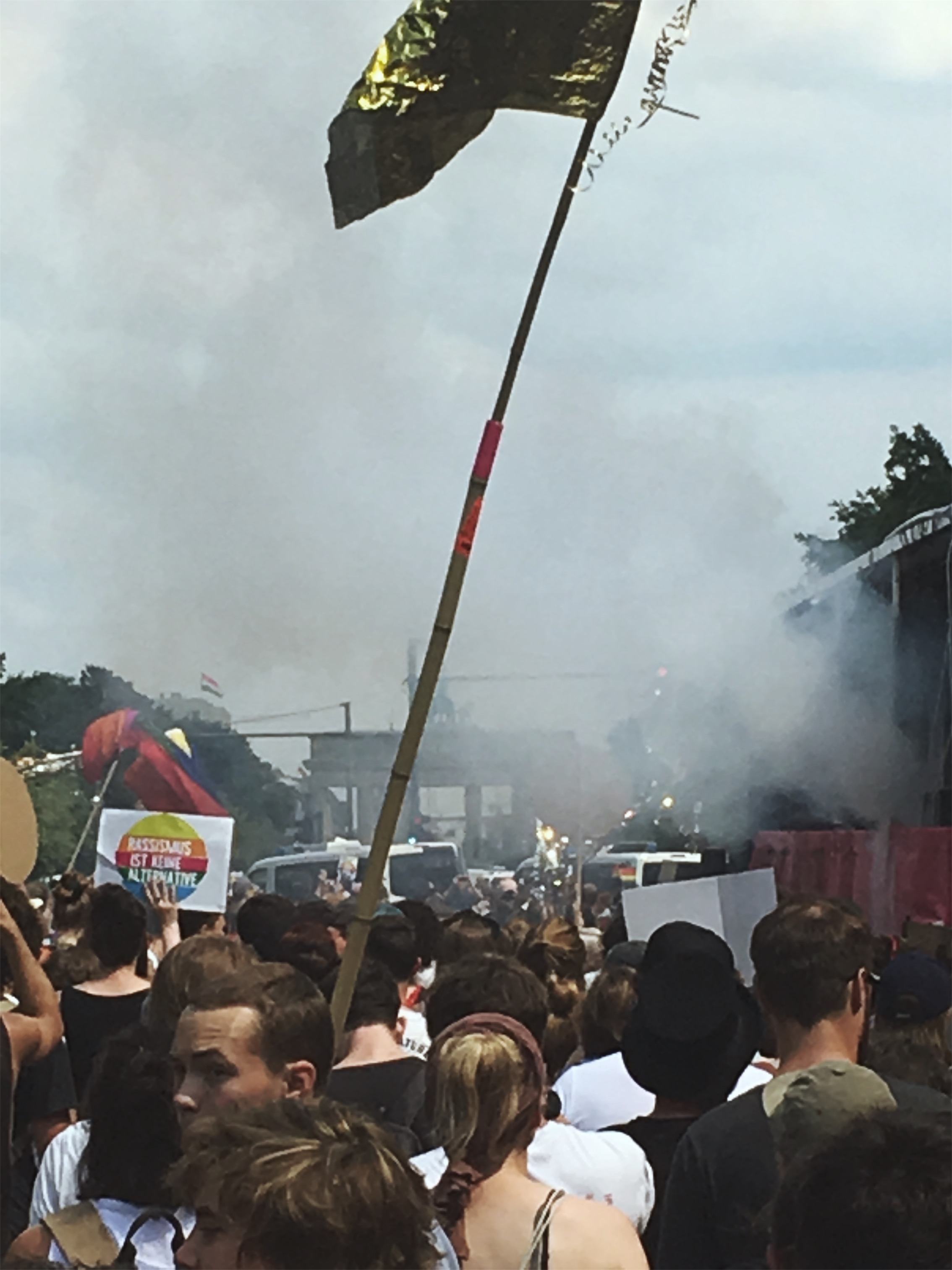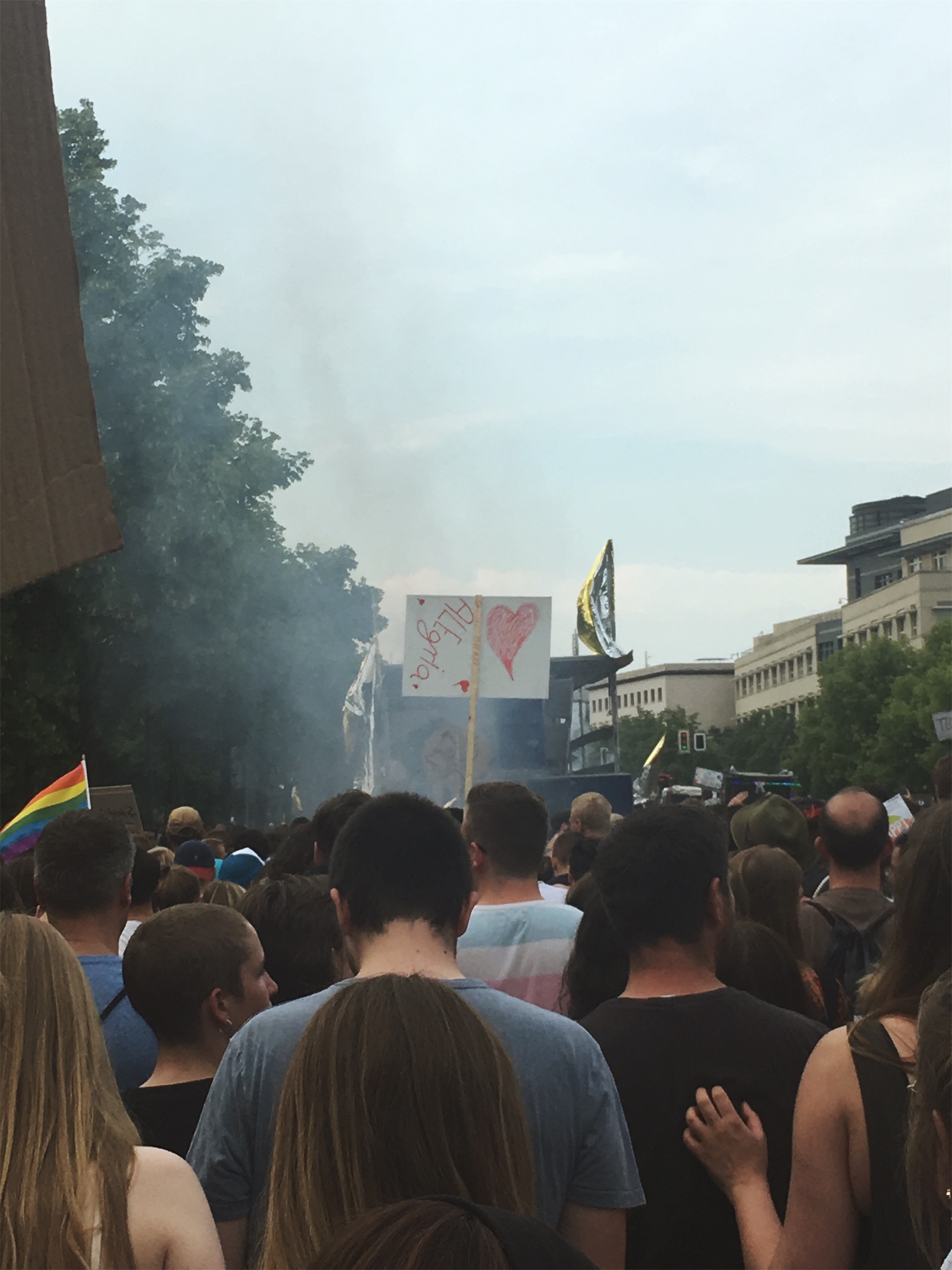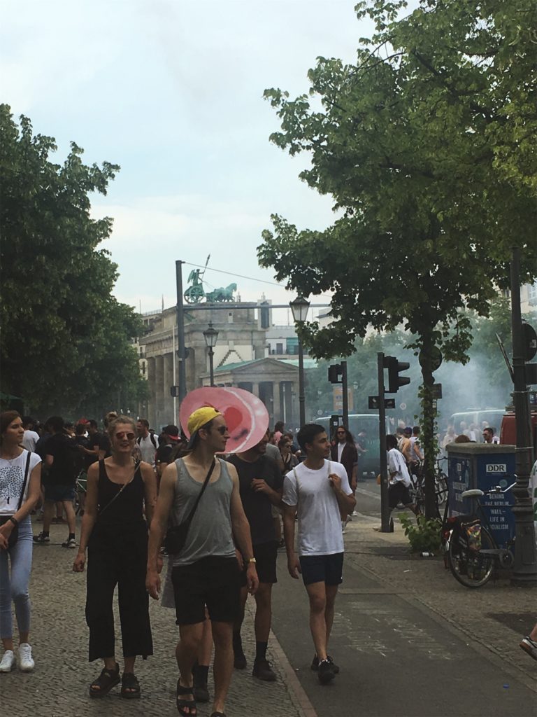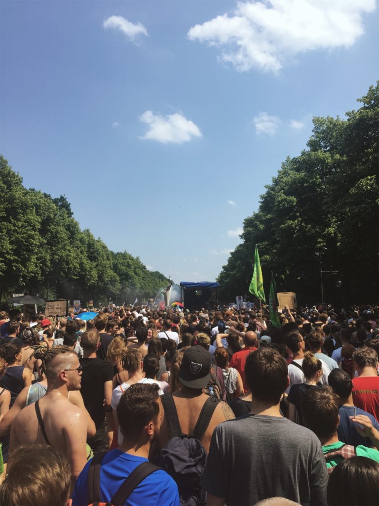 Die Hilfsbereitschaft vor Ort war groß: Wem in der Hitze an Wasser fehlte, durfte überall mittrinken, wer zur Pause an den Rand des Zuges wollte, wurde freundlich durchgelassen. Man mag vielleicht einwenden, dass dieses Spektakel auch viele Schaulustige anzog, die nur des Feierns wegen teilnahmen. Dies trifft aber nicht den Charakter der Veranstaltung: Etliche Initiativen wie der Queer Block oder Aufstehen gegen Rassimus standen Schulter an Schulter auch mit etablierten Parteien wie Die Grünen, Die Linke oder der SPD, um aktiv für ihre Rechte und gegen eine Beschneidung dieser einzustehen. Der überwiegende Teil wirkte fokussiert, trunken höchstens vor Euphorie des Moments.