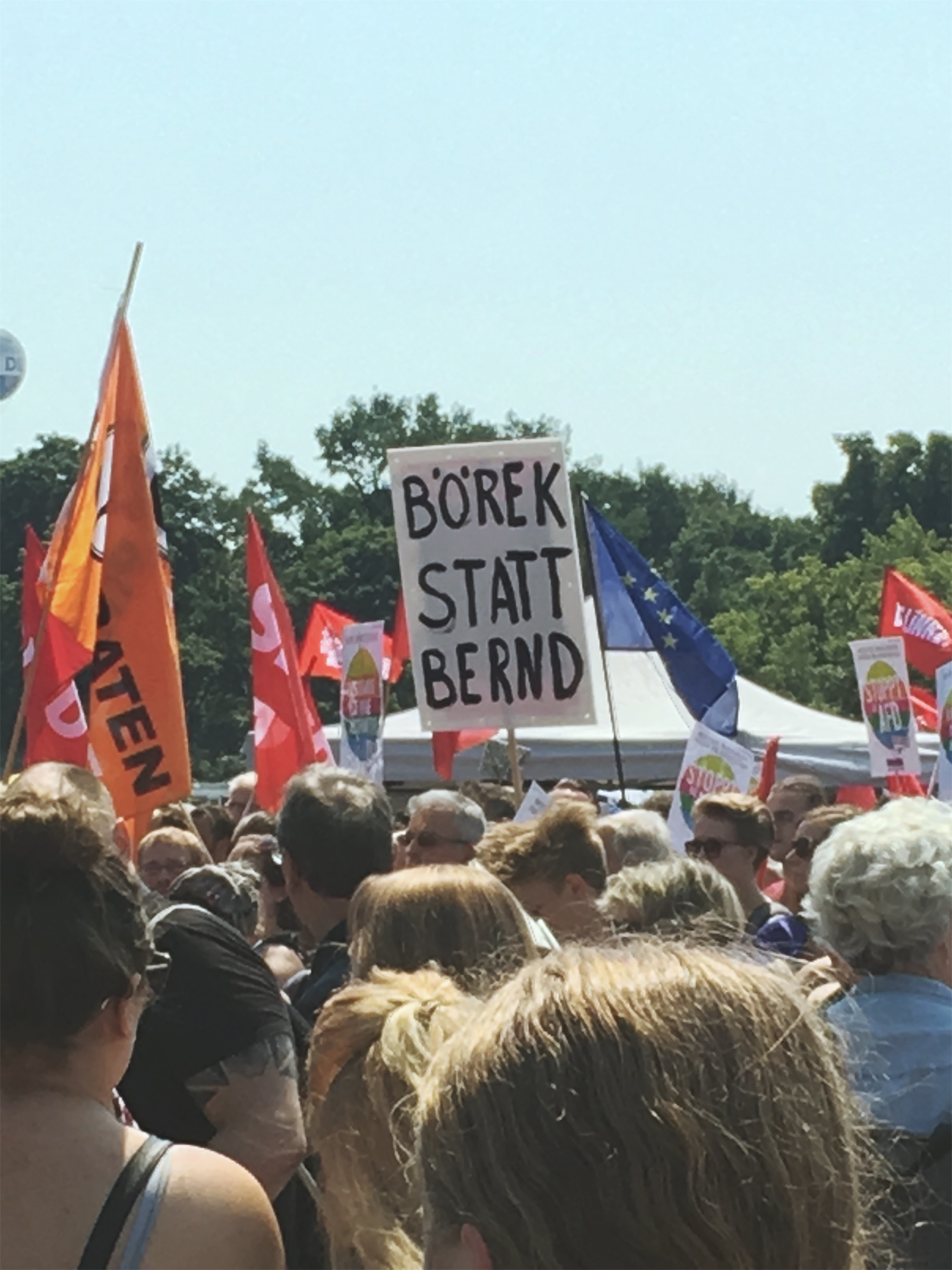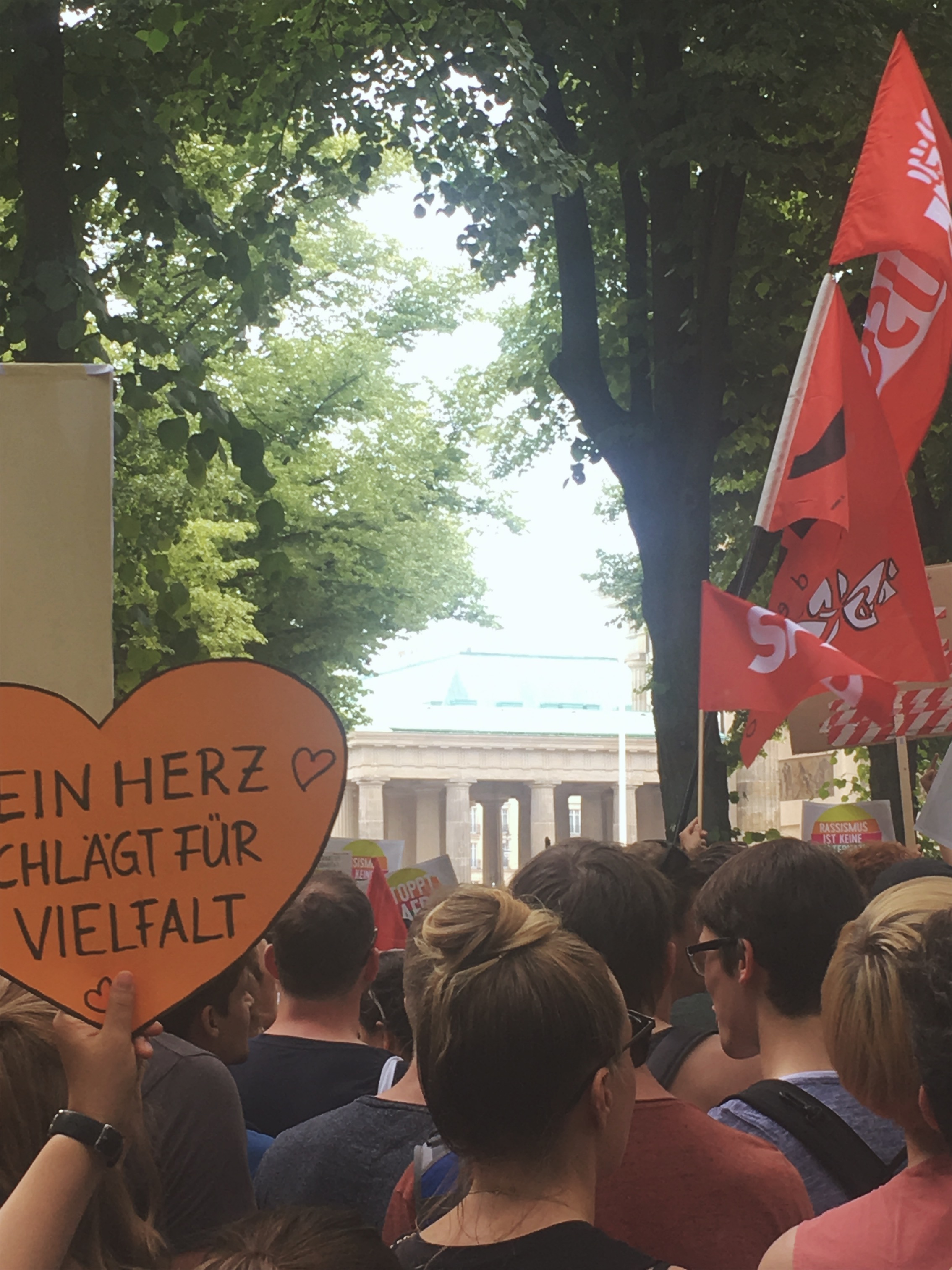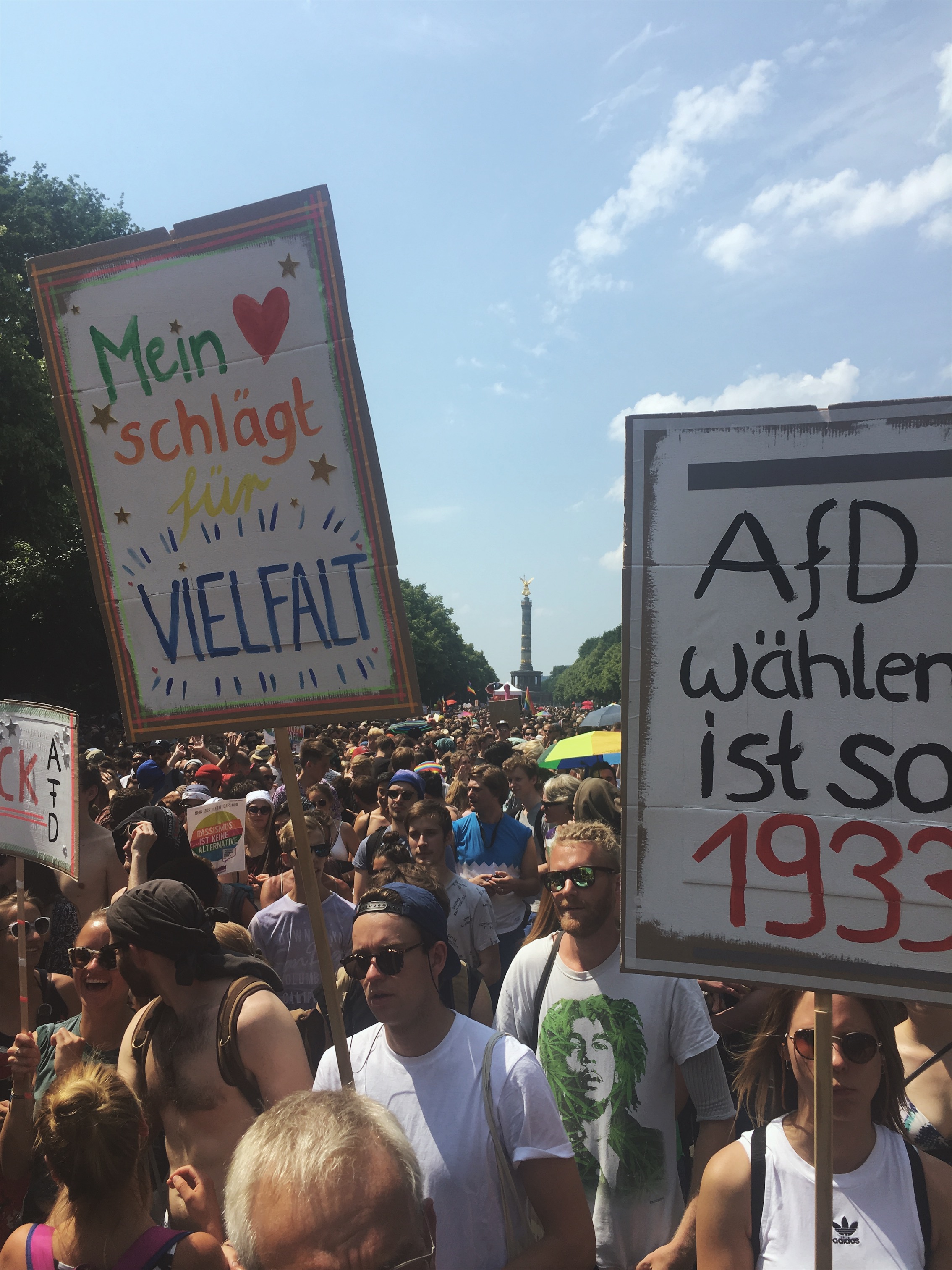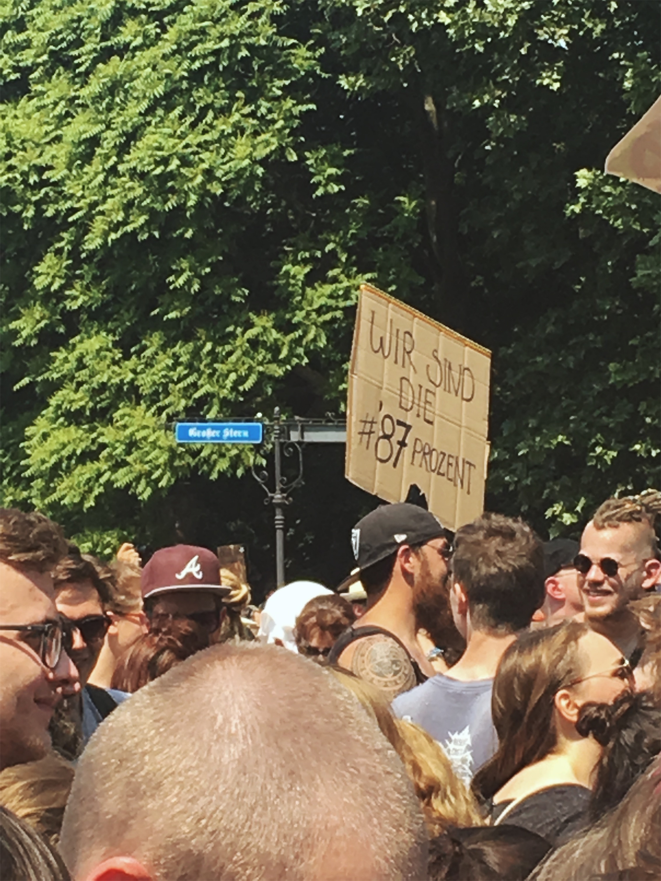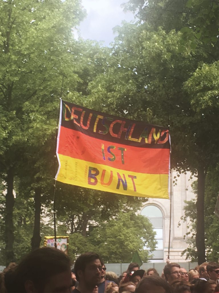 Die Hilfsbereitschaft vor Ort war groß: Wem in der Hitze an Wasser fehlte, durfte überall mittrinken, wer zur Pause an den Rand des Zuges wollte, wurde freundlich durchgelassen. Man mag vielleicht einwenden, dass dieses Spektakel auch viele Schaulustige anzog, die nur des Feierns wegen teilnahmen. Dies trifft aber nicht den Charakter der Veranstaltung: Etliche Initiativen wie der Queer Block oder Aufstehen gegen Rassimus standen Schulter an Schulter auch mit etablierten Parteien wie Die Grünen, Die Linke oder der SPD, um aktiv für ihre Rechte und gegen eine Beschneidung dieser einzustehen. Der überwiegende Teil wirkte fokussiert, trunken höchstens vor Euphorie des Moments.