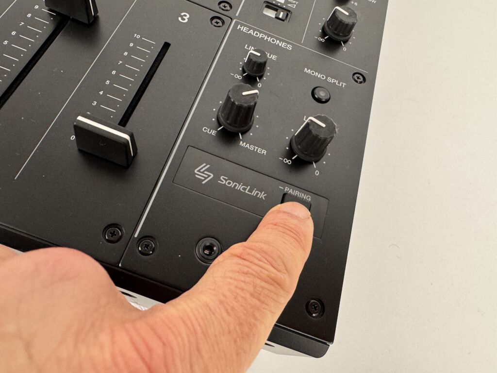 Der Mixer bietet eine 6,3-mm- und eine 3,5-mm-Kopfhörerbuchse und unterstützt zudem die proprietäre Drahtlostechnik SonicLink. Über diese kann der AlphaTheta HDJ-F10 nach erfolgter Kopplung per Tastendruck ohne zusätzlichen Transmitter verwendet werden. Ergänzend hat der Mixer auch ein SonicLink-Touchfeld auf der Vorderseite, das eine berührungslose Kopplung für drahtlose Kopfhörer ermöglicht. Entsprechend kompatible Kopfhörer sind allerdings noch Zukunftsmusik.
