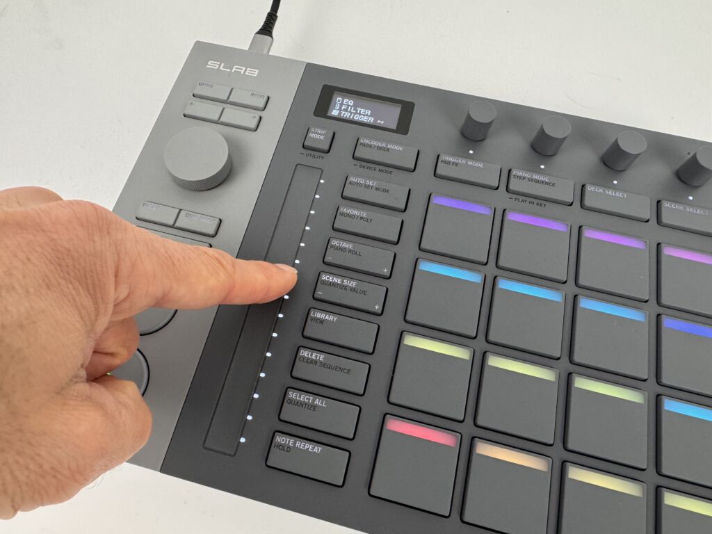 Eine weitere Option, um für spannende Sounderlebnisse zu sorgen, ist der Touch-Slider. Im Encoder-Modus "Deck Parameter” kann er das Dualmode-Filter, Note Repeat, Pitch Bend oder Swing kontrollieren.