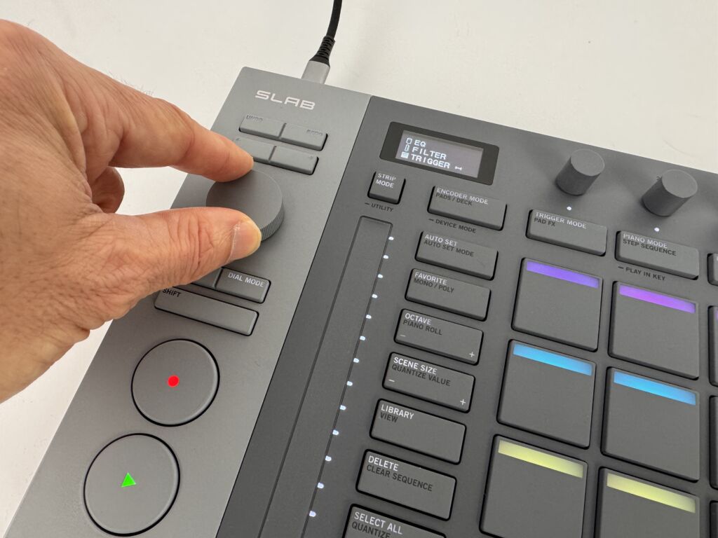 Serato bietet verschiedene Möglichkeiten, Effekte zu nutzen. Während für Drum- und Sample-Decks jeweils einzelne Sounds und das gesamte Deck mit Effekten bearbeitet werden können, gibt es für Instrumente nur die Möglichkeit, das komplette Signal zu modifizieren. Mit den Encodern des SLAB lassen sich die Effekte ein- und ausschalten sowie die Parameter gezielt steuern.