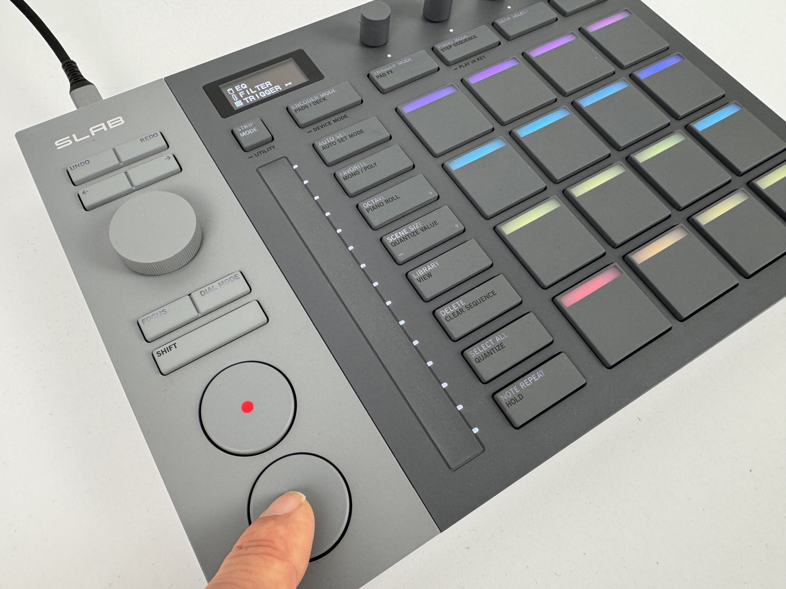 Designtechnisch ähnelt der AlphaTheta SLAB typischen Pad-Controllern wie Native Instruments Maschine, Novation Launchpad oder Akai APC. Mit den Maßen 284 x 209 x 45 mm und einem Gewicht von 1 kg ist das Gerät recht leicht transportierbar, wenn ein Einsatz unterwegs oder auf der Bühne geplant ist. Der Controller ist dunkel- und hellgrau lackiert, wodurch er sehr dezent und modern wirkt. Das Gehäuse ist leicht angeschrägt, sehr gut verarbeitet und die Materialanmutung ist ansprechend. Neben gummierten, beleuchteten Pads gibt es illuminierte Taster, zahlreiche weitere Bedienelemente aus Kunststoff, einen Touchstrip sowie ein kleines OLED-Display.