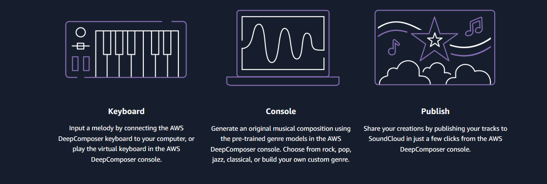 Das Projekt fällt unter Amazons Web Service Sparte (AWS) und kommt in Form eines auf den ersten Blick handelsüblichen kompakten MIDI-Keyboards. Einfach an den Rechner angeschlossen, füllt es kurze und einfache Melodien zu komplexen Kompositionen auf. Sobald eine Melodie eingespielt wurde, kann der User zwischen verschiedenen musikalischen Stilen wie Rock, Pop, Jazz oder Klassik auswählen und der Rest des Songs wird automatisch um passende Spuren aus Schlagzeug, Bass und Begleitung ergänzt. Das alles passiert quasi in Echtzeit via Cloud, in der dann via Generative AI, eine Art Machine Learning, aus der eigenen Melodie der gesamte Titel errechnet wird.