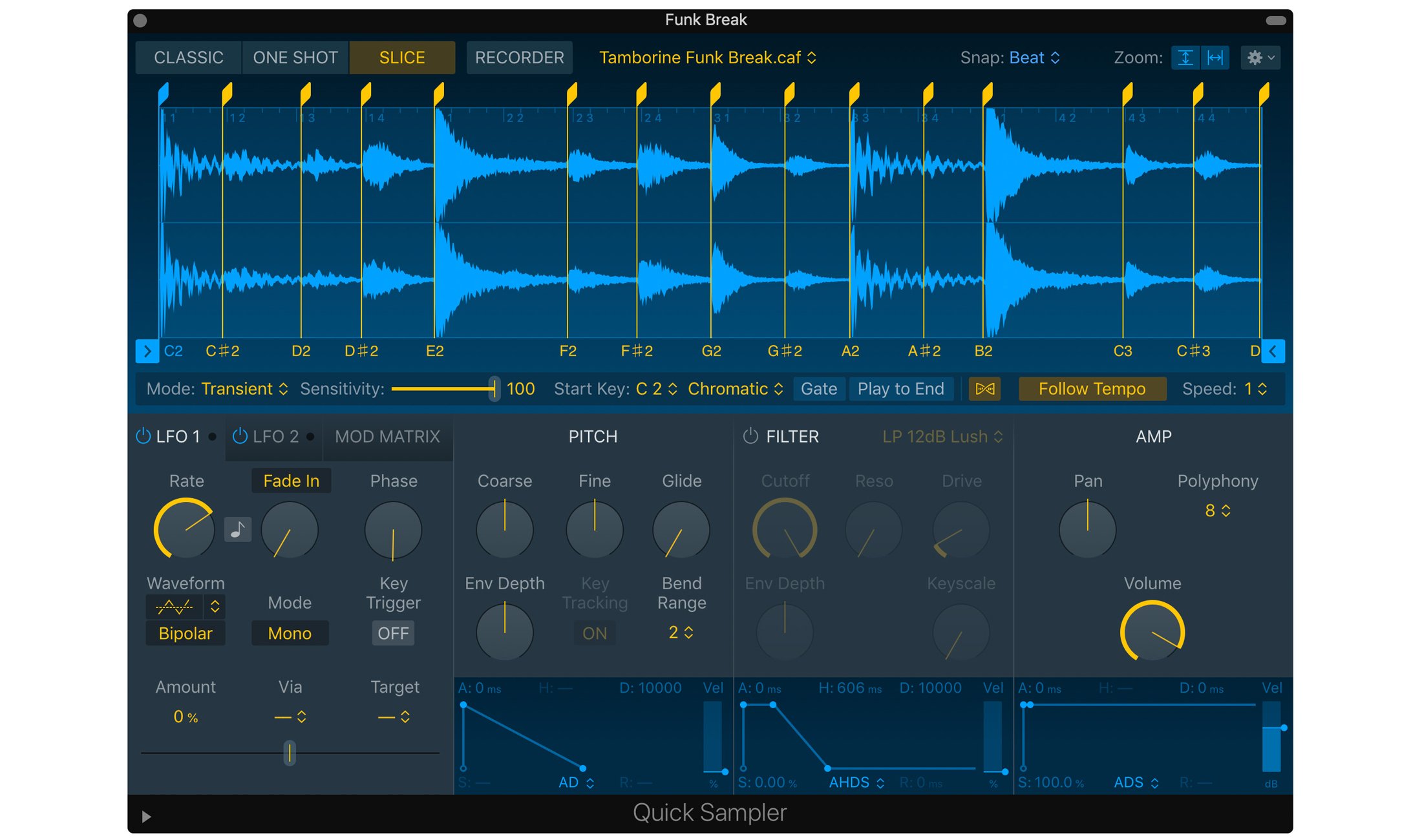 Mit Sampler bekommt der gute alte EXS24 einen Nachfolger. Neue Möglichkeiten für Sounddesign soll dieser bieten und dabei Abwärtskompatibilität gewährleisten. Anderenfalls wäre es auch ein Jammer, denn langjährige User werden bestimmt große Libraries für EXS24 angelegt haben. Quick Sampler ist eine vereinfachte Variante, die aber immer noch genug Optionen für Klanggestaltung bietet.
