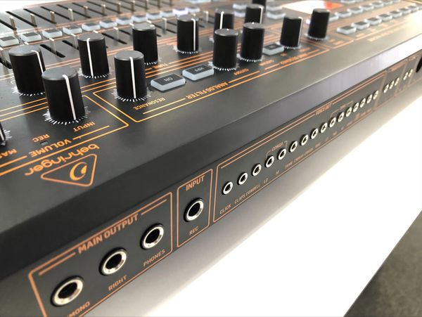 Die Pads sind jetzt im Gegensatz zur LinnDrum gummiert und es gibt zusätzlich 16 weitere auf der rechten Seite zur Auswahl der Instrumente und um einen Lauflicht-Sequencer einzubauen. Ebenfalls neu ist eine „Wave Designer“ und „Analog Filter“ Sektion die man bereits von Behringers RD-Geräten kennt. Was die Anschlüsse angeht, hat Behringer der LmDrum scheinbar nahezu alles mitgegeben. Zumindest lässt das Bild der Rückseite einiges erahnen.
