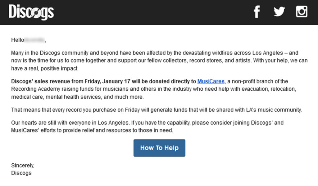 Am 13. Januar verschickte der Vinyl-Marktplatz eine E-Mail mit der Betreffzeile "We're Donating to Those Affected by the LA Fires – And You Can Help" an seinen Benutzerstamm von gut 110 Millionen Menschen. Am 17. Januar, hieß es darin, würden alle der normalerweise von Discogs erhobenen Gebühren von 9 Prozent auf den Verkaufspreis und die Versandkosten (dazu gleich mehr) an die oben genannte Organisation MusiCares gespendet. Auch das klingt erst einmal irgendwie normal, erinnert das Prinzip doch deutlich an die hinlänglich bekannten Bandcamp Fridays. Doch wie in jenem Fall entpuppt sich die Kampagne von Discogs bei genauerem Hinsehen als reines Marketing. Und die Betreffzeile der E-Mail als Unwahrheit.