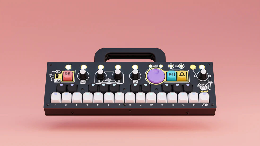 Das Sampling-Engine beruht auf der Daisy-Plattform, die ein unkompliziertes Sampling und zukünftige Firmware-Updates ermöglicht. Ein Druck auf den roten Knopf startet die Aufnahme, die dann direkt über die Cherry-Keys in zwei Oktaven chromatisch abgespielt werden kann. Größtenteils werden die Samples über das eingebaute Mikrophon aufgenommen, zusätzlich steht aber auch noch ein 3,5mm AUX-In zur Verfügung. Das Sample kann über die Encoder noch nachträglich angepasst werden. Start- und Endpunkt, Abspielrichtung und -geschwindigkeit, sowie Attack und Release lassen sich leicht und intuitiv verändern. Dabei setzt CHOMPI voll auf das Gehör und verzichtet auf einen Bildschirm.