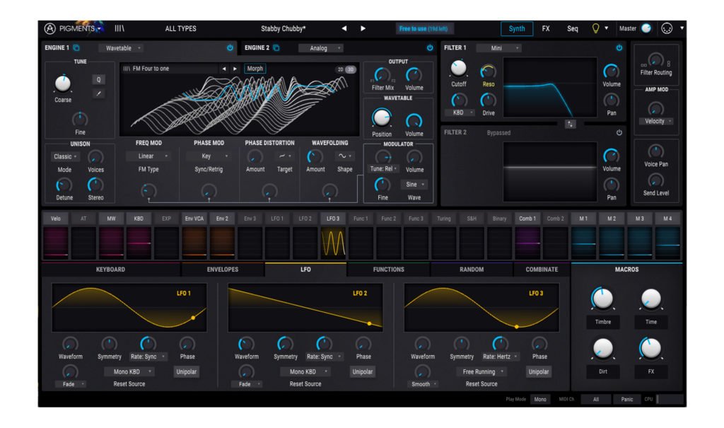 Das französische Unternehmen Arturia hat sich bis zum Ende des Jahres Zeit gelassen, um uns völlig überraschend einen neuen Soft-Synth zu präsentieren. Und dass es auch noch eine komplette Eigenentwicklung und keine Emulation ist – damit hat wohl kein Mensch gerechnet. Pigments kombiniert Virtuell-analog- mit Wavetable-Synthese und verpackt das mit einer wahnsinnigen Liste von Features: LFOs, Envelopes, Sample-and-Hold, Makros, Filter, Effekte und noch mehr. Alles lässt sich miteinander kombinieren und gegenseitig beeinflussen, Effekte können seriell oder parallel arbeiten – die Möglichkeiten scheinen fast unbegrenzt. Der Sound überzeugt auf ganzer Linie und auch die GUI ist ein Hingucker. Wir empfehlen dringend den Download der vollumfänglichen Demo-Version! Bis zum 10. Januar ist Pigments für 149 Euro erhältlich, danach müssen 199 Euro auf den virtuellen Tisch gelegt werden.
