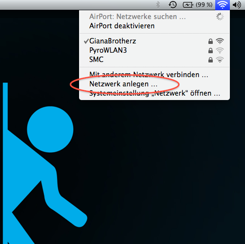 Auf einem MAC klickt man zunächst oben rechts auf das W-LAN Symbol und im Pull-Down Menü anschließend auf Netzwerk anlegen.