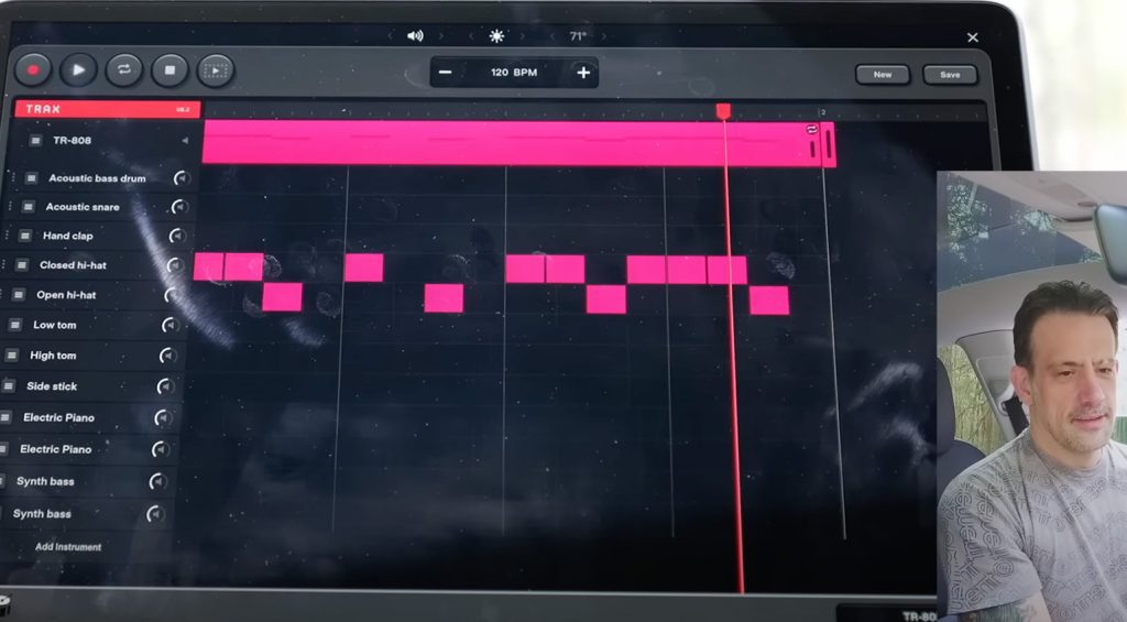 Jordan setzt sich auf den Fahrersitz und beginnt zu experimentieren. Der erste Kritikpunkt ist auch schon da: Die Hi-Hat aus dem TR-808-Kit hat keine Mute-Gruppen. Daher schließt die offene Hi-Hat nicht, wenn die geschlossene ausgelöst wird. Die Bedienung ist sonst sehr einfach, weshalb er sich an den ersten Melodien mit der Piano-Roll versucht. Überzeugt ist er von den Sounds allerdings nicht. Jordan vergleicht die Instrumentenklänge mit den General-MIDI-Patches, die man in Keyboards, Soundkarten und Modulen aus den 80er und 90er Jahren findet. Dann stürzt die App plötzlich ab, doch Jordan beginnt noch einmal von vorne.