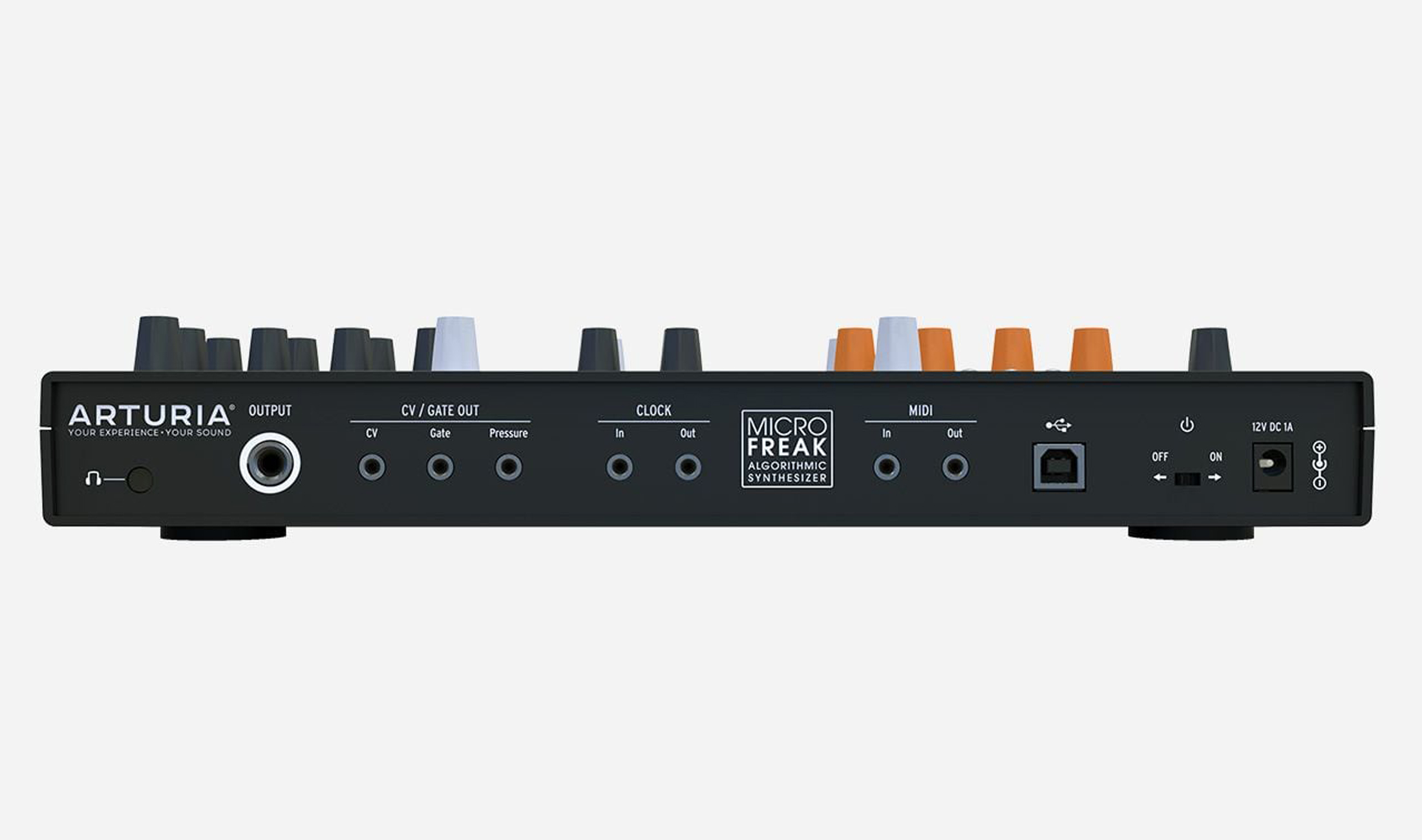Was gibt es denn konkret zu dem neuen Arturia-Synth zu sagen? Spannend ist zunächst der Oszillator – diesmal nicht analog aufgebaut, sondern digitaler Natur. Dieser kann in unterschiedlichen Modi laufen und statt einfachen Schwingungsformen gleich unterschiedliche Syntheseformen (Physical Modeling, Wavetable Synthese, Virtuell-analog) anbieten. Die dafür zur Verfügung stehende Auswahl macht schon dem Namen nach neugierig: Texturer, Karplus-Strong, Harmonic OSC und Superwave. Als Kontrapunkt folgt ein Analogfilter, das diesmal nicht im Steiner-Parker-Design, sondern als 12-dB Oberheim SEM mit der Fähigkeit zur Selbstoszillation daherkommt. Eine weitere Überraschung! Zusätzliche Pluspunkte gibt es für den internen Sequenzer und die Mod-Matrix. Der Sequenzer kann mit verschiedenen Zufalls-Algorithmen gefüttert werden und verspricht somit mehr Abwechslung und einige „Happy Accidents“. Anstatt auf eine Tastatur wie bei dem in der Form nicht unähnlichen MicroBrute zu setzen, verwendet Arturia hier eine Art Leiterplatine. Das sieht nicht nur futuristisch aus, sondern hat auch ein praktisches Nutzen. Polyphoner Aftertouch ist damit neben unterschiedlicher Anschlagstärke möglich, im Ergebnis sorgt das für mehr Ausdrucksmöglichkeiten beim Musizieren. Für ein gutes Zusammenspiel mit Synths wie dem gerade genannten MicroBrute oder den anderen Synths von Arturia (oder modularen Gerätschaften) sind auf der Rückseite Ausgänge für CV, Gate und Modulation. Weiterhin gibt es noch In und Outs für Clock-Signale und MIDI.