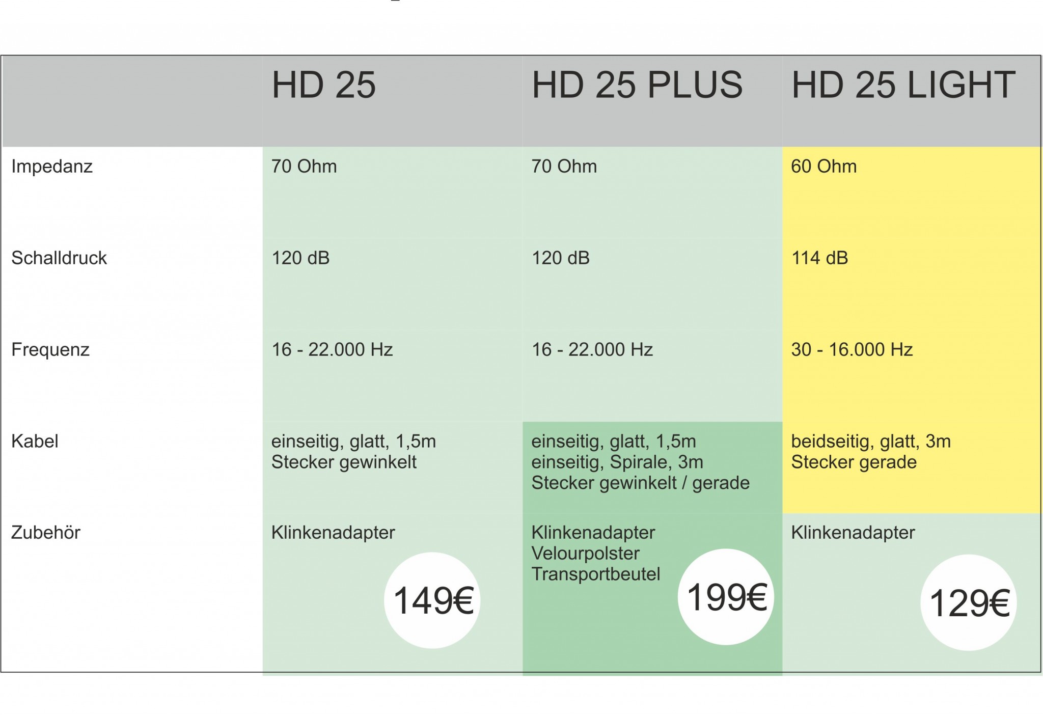 An Einsteiger ist ein HD25 LIGHT (bisher HD25 SPII), mit anderen Treibern, adressiert. Dessen Bügel ist einteilig, die Impedanz liegt bei 60 Ohm und der Schalldruck bei 114dB. Das gerade Kabel mit geradem Stecker ist beidseitig geführt und drei Meter lang.