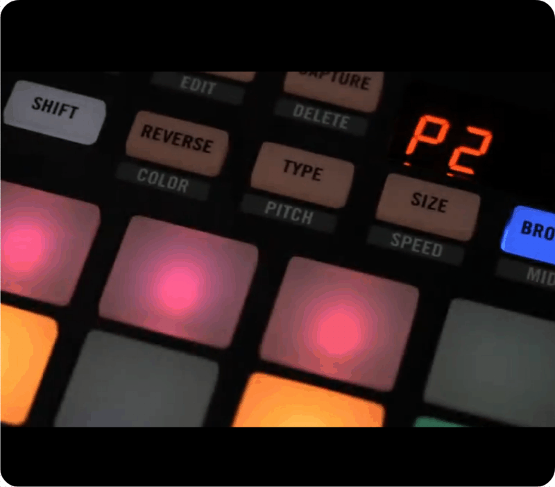 Hauptbestandteil sind jedenfalls die 16 Triggerpads, die in einer 4x4 Matrix angeordnet sind und in verschiedenen Farben illuminiert werden können. Die Farben deuten dabei in erster Linie auf die unterschiedlichen Samples hin: anscheinend kann man durch eigene (oder auch vorgegebene) Farbwahl Sample-Typen und -Gruppen einfärben und sie so besser voneiander unterscheiden.