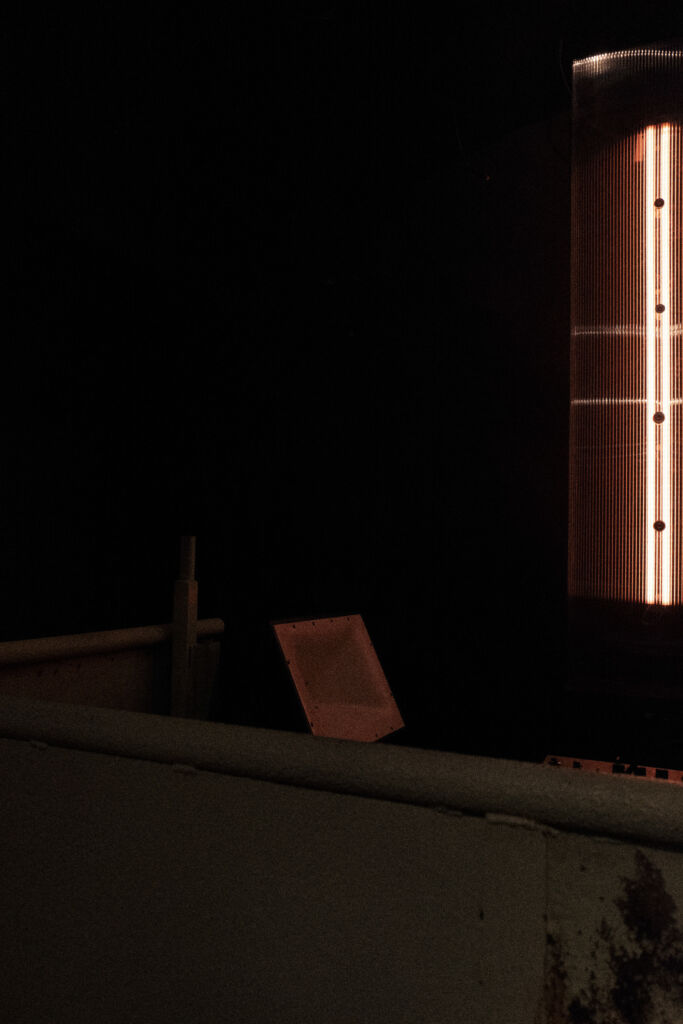 Gregor, Robert und Soey empfangen mich vor dem Haupteingang, zwischen Bauschutt und Containern. Es wird gesägt, ausgemessen, fotografiert, kleine Steine in große Wannen gekippt. Wir gehen rein, über den großen Floor, eine schmale Treppe hinauf und sprechen auf dem zweiten, kleineren Floor miteinander. Schnell werden drei Sessel zusammengeschoben, eine Kiste als Tisch umfunktioniert, eine letzte Zigarette geraucht.