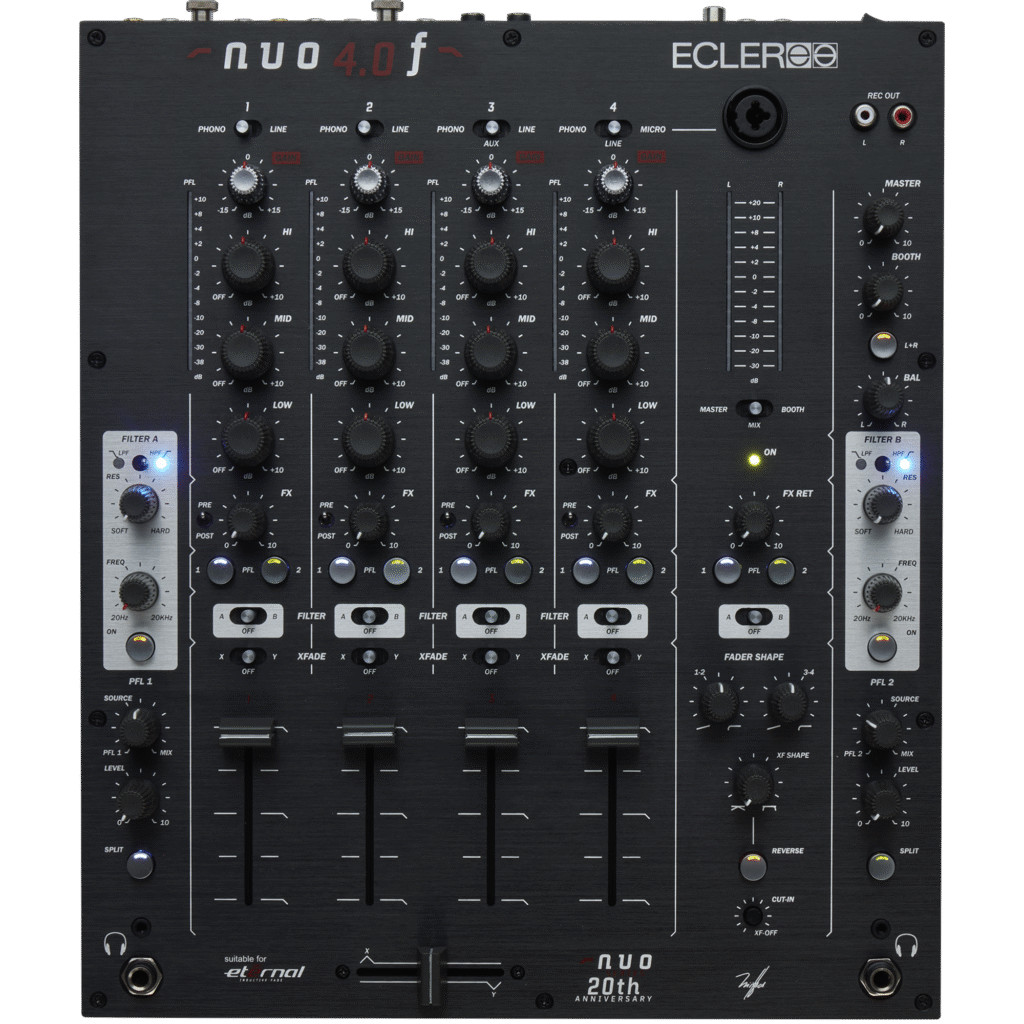 Die NUO-Mixer des spanischen Herstellers Ecler blicken auf eine lange Geschichte zurück und sind bis heute in der DJ-Szene sehr beliebt. Die soliden, analogen Geräte NUO 2.0, NUO 3.0 und NUO 4.0 boten zahlreiche Funktionen, darunter Full-Cut-EQs, eine FX-Schleife und anpassbare Faderkurven. Eine weitere Besonderheit war der nachrüstbare, magnetische Eternal Crossfader, der für seine Langlebigkeit und präzise Ansprache bekannt ist.