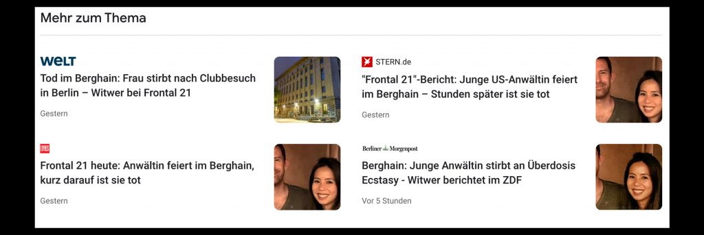 Schade übrigens, dass unsere Pressekollegen sich aus dem Beitrag das herausziehen, was am meisten Klicks garantiert: Eine saftige Headline über einen Überdosis-Tod im Berghain. Ist das wirklich die Thematik, mit der sich der Frontal 21 Beitrag befasst? Ist das der angestoßenen Diskussion über die Drogenpolitik förderlich?