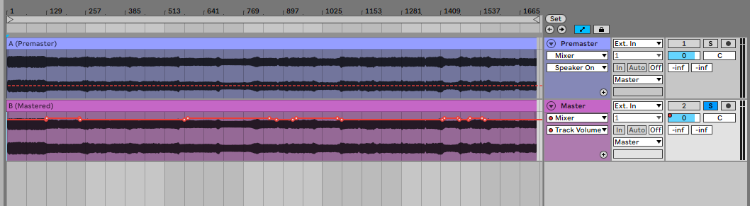 Tipp: Ziehe den Mix doppelt in die DAW. In der ersten Spur bleibt der unangetastete Original-Mix, die zweite Spur ist die Mastering-Spur, in der alle Änderungen vorgenommen werden. So kannst du während des gesamten Prozesses immer wieder abgleichen, wie die Nachbearbeitungsmaßnahmen im Vergleich zum Original klingen, und ob eine weitere Modifikation der Effekt-Einstellungen nötig ist. Dieses Verfahren nennt sich A/B-Vergleich. Wichtig ist dabei, dass du die Spuren so einstellst, dass sie gleich laut klingen, da für das menschliche Gehör lautere Musik erst einmal besser klingt.