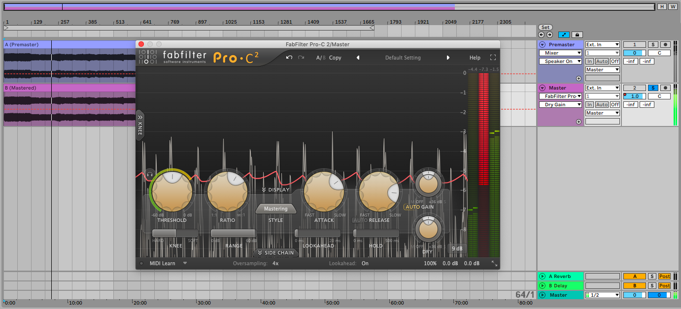 Dies ist sinnvoll, da gemasterte Tracks oftmals schon mit einem Kompressor bearbeitet wurden. Insofern sollte bei der Nutzung eines Kompressors darauf geachtet werden, dass dieser nicht zu sehr in die bestehende Dynamik der Tracks eingreift, sondern diese unterstützt (es sei denn, der Effekt ist gewollt).