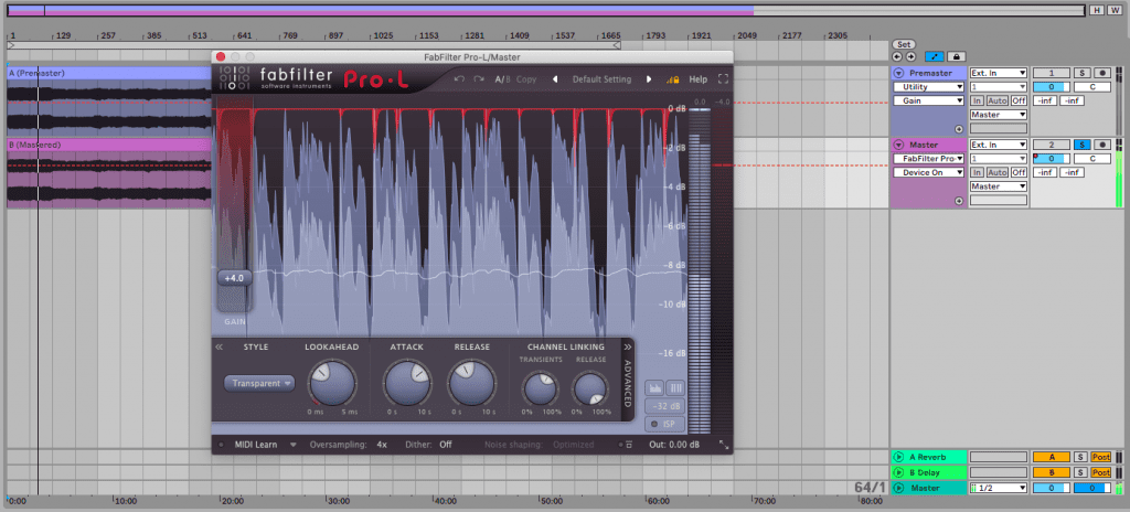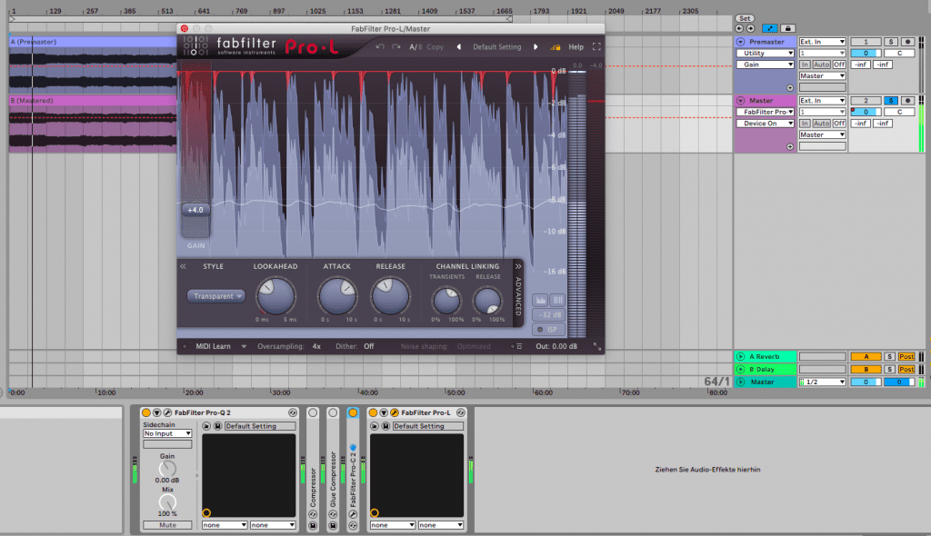 Eine Alternative stellt der FabFilter Pro-L 2 dar. Hier habe ich bei Style “transparent” eingestellt sowie Lookahead 1.74 ms, Attack ca. 2000 ms, Release ca. 500 ms (Richtlinie: längere Attack, kürzeres Release), Oversampling 4x, und in meinem Fall +4 dB Gain. Auch hier gilt, dass sie spezifischen Einstellungen sehr von deinem Audiomaterial abhängig sind. Dies gilt besonders für den Gain-Wert.