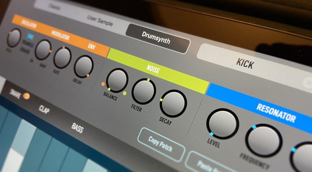 Dazu kommt ein recht einfach gehaltener Drum-Synthesizer mit einem Oszillator (Rechteck, Sinus, Dreieck), einer Modulations-Sektion, einer Hüllkurve sowie Noise- und Resonator-Funktion. Im Sequencer stellt ihr wie gewohnt Velocity, Pitch, Decay, Chance oder Sample-Start ein und habt zusätzlich die Möglichkeit Polyrhythmen und Polymetrik einzubauen. Global könnt ihr eure Pattern mit der Shuffle-Funktion etwas lebhafter gestalten. Neben dieser gibt es allerdings auch noch eine „Soul“-Funktion, die euern Loops durch leichte Verschiebungen etwas mehr, nun ja, Soul gibt. Abgerundet wird alles durch Distortion und einen Kompressor, die ihr den einzelnen Sounds zuweisen könnt und dem Glitch- und Mutation-Feauture. Per MIDI lassen sich zudem nicht nur alle acht Drumsounds ansteuern, sondern auch ganze Pattern starten.