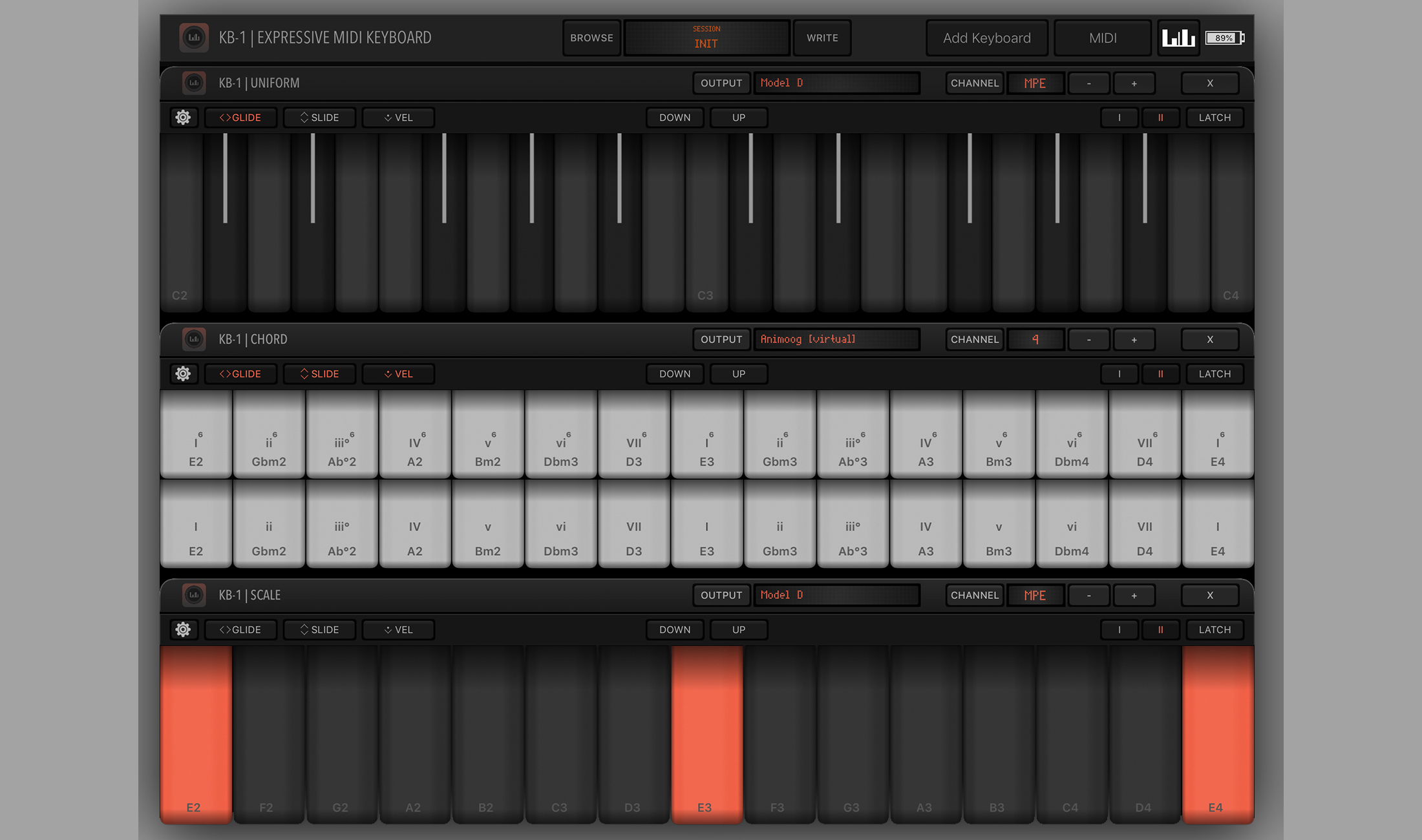 KB-1 dient als Masterkeyboard, Performance-Tool oder als Ersatz für das interne DAW-Keyboard. Fünf Layouts sorgen für die nötige Flexibilität. Ausdrucksstark wird KB-1 mit dem MPE-Support. MIDI Polyphonic Expression ermöglicht das Verändern von mehreren Parametern beim Spiel von Noten und wird aktuell in immer mehr Klangerzeugern integriert, sowohl bei Soft- als auch Hardware. Es ist davon auszugehen, dass MPE in Zukunft im Update des MIDI-Protokolls berücksichtigt wird. MPE ermöglicht Spielweisen wie Slides und Glides – beides beherrscht die App. Sogar Velocity wird umgesetzt. Dafür benutzt man einfach die X-Achse einer Taste.