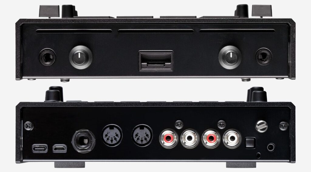 Der Sampler besitzt ein integriertes USB-Audiointerface, wodurch sowohl Audiosignale eines Rechners gesampelt werden können, als auch Audio direkt in einer DAW aufgenommen werden kann. Dazu kommen Stereo Ein- und Ausgänge als Cinch-Anschluss (der Eingang kann als Line oder Phono geschaltet werden), MIDI In/Out, zwei Mal USB und einen 3,5 mm Aux-Eingang. An der Vorderseite findet man zudem noch einen Kopfhörereingang und einen Mikrophoneingang (nur für dynamische Mikros).