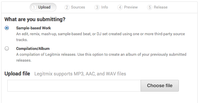 In der Praxis ist ein eigenes Produkt innerhalb weniger Minuten erstellt. Ich wähle beispielhaft einen Edit aus, den ich soeben am heimischen Rechner erstellt habe. Den kann ich als MP3, AAC oder Wave-Datei bei LEGITMIX hochladen. Anschließend besteht die Auswahl zwischen "Sample Based" und "Compilation".