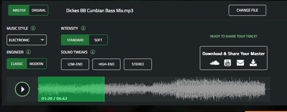 Im letzten Schritt kann man das fertige Master downloaden, zu Soundcloud sowie Youtube exportieren oder an eine Mail-Adresse senden. Das fertige File wird in CD-Qualität (16bit / 44,1kHz Wav) bereitgestellt.