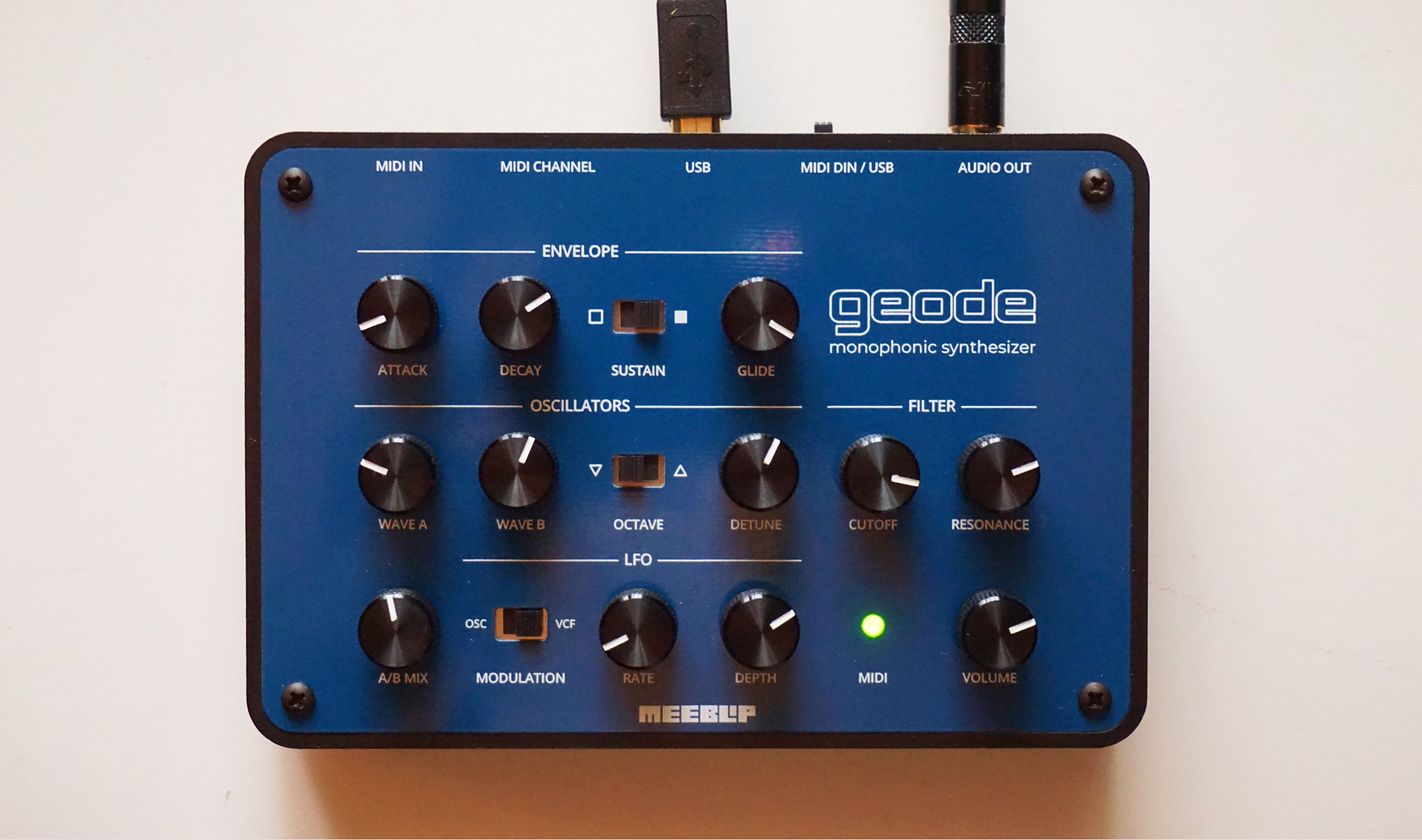 Der Geode verbindet das Beste aus zwei Welten: Die Oszillatoren sind digital und das Filter ist analog. Im Mai kommt der kleine blaue Synthesizer raus und stellt die vierte Generation der MeeBlip-Reihe dar.