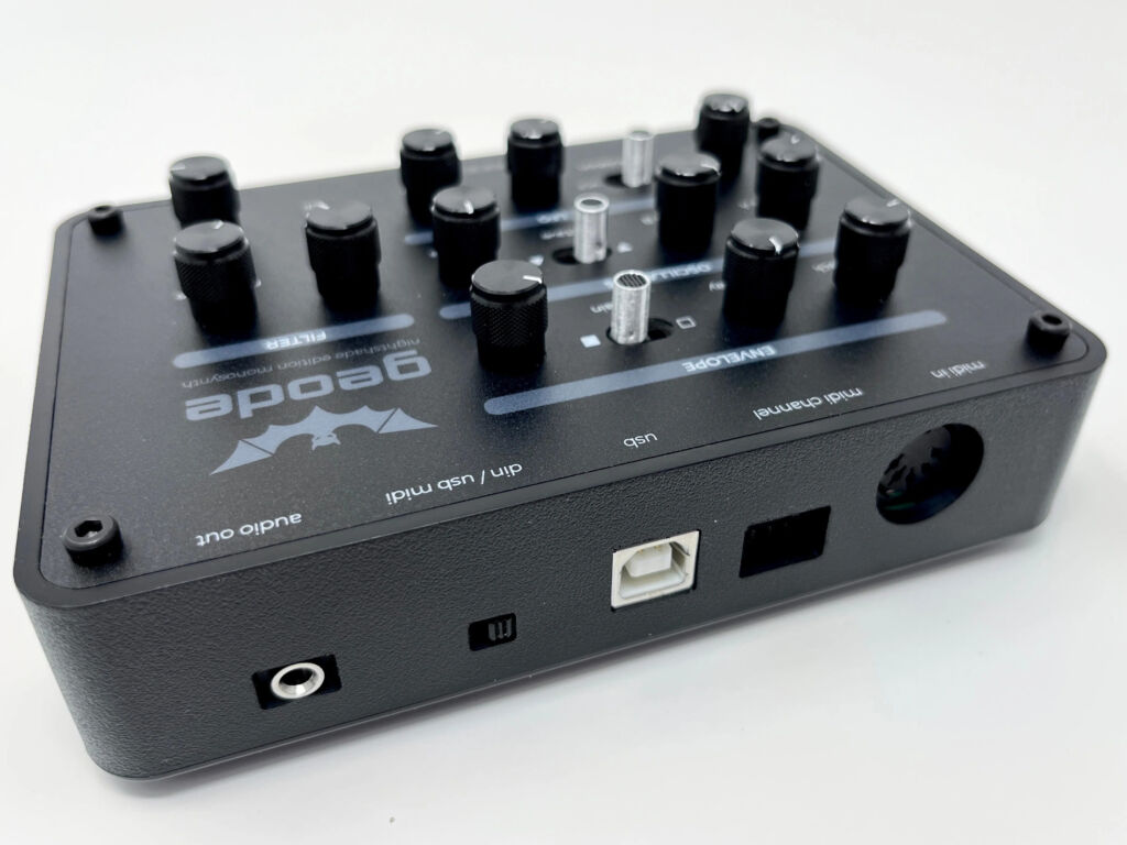 Der monophone Synthesizer ist mit zwei digitalen Oszillatoren ausgestattet, die PWM, Pulsbreite, Sägezahn, Dreieck (nur OSC 1) und Rauschen (nur OSC 2) erzeugen können. Die Oszillatoren können frei gemischt, einzeln verwendet, detuned oder per Oktavschalter als Sub verwendet werden. Geode verfügt über ein analoges MeeBlip-Filter, das auf einem Gitarrenverzerrer aus den 70er Jahren basiert. Die Modulationssektion enthält eine ADS-Hüllkurve (Attack, Decay, Sustain) mit Glide-Parameter und einen LFO, der das Filter oder die Tonhöhe verändert.