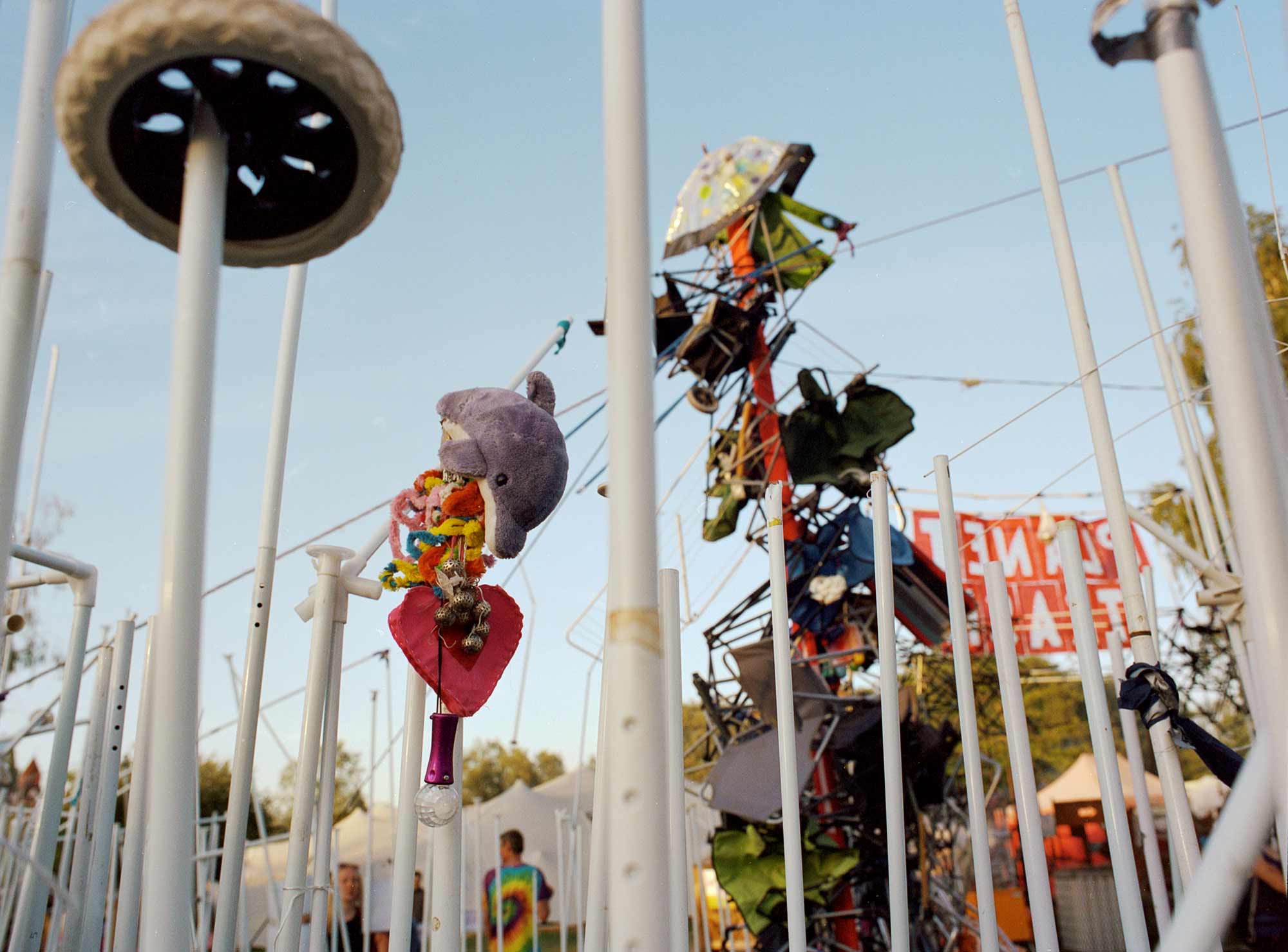 Auch der Plastikschredder, mit dem die Gäst*innen bunte Plastikreste zu Amuletten verarbeiten konnten, war ein Publikumsmagnet. „Das benutzte Material war allerdings nur ein Bruchteil von dem, was im Vorjahr zurückgelassen wurde“, beschreibt Isabel. Den Großteil der zurückgelassenen Sachen – hauptsächlich Zelte, Pavillons und Campingstühle – hatte die Crew sogar noch in funktionstüchtigem oder nur leicht beschädigtem Zustand gesammelt.