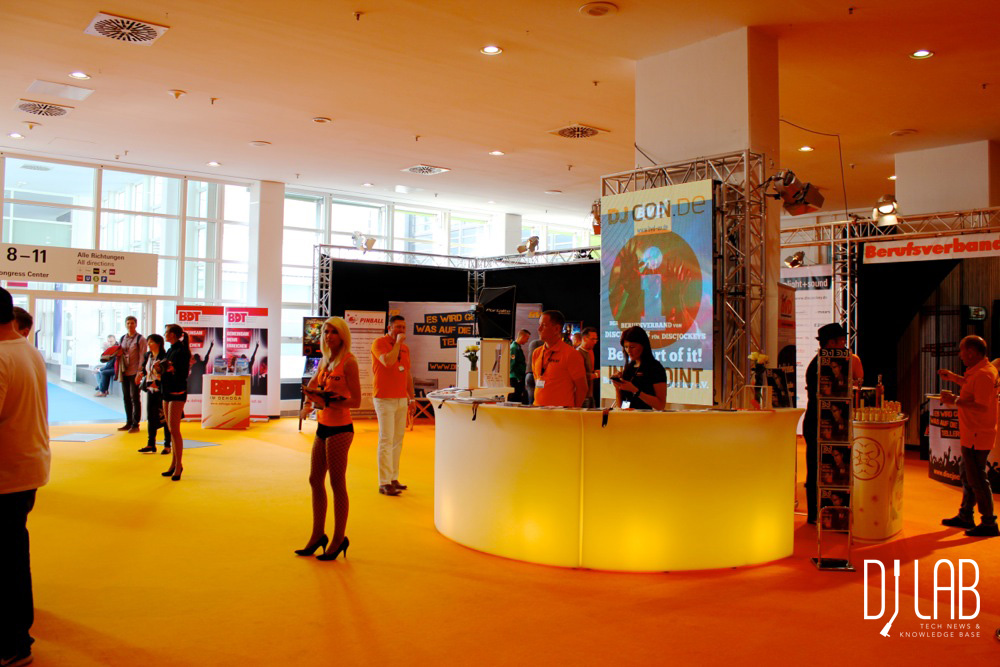 im Übergang von Halle 5.1 zur Halle 6.1 befand sich erneut die DJCon. Das waren ca. 900qm, die vom Berufsverband Discjockey e.V. (BVD) betreut wurden und auf die sich Reloop, Denon DJ, Mixars, Allen & Heath und Pioneer DJ mit ein paar Tischen reingemogelt hatten. Das in Orange getränkte Areal mit einer kleinen Ecke für Vorträge und einer DJ-Kanzel auf der gegenüberliegenden Seite, stand ganz in der CI des BVD und versprühte den Scharm vergangener DJ-Meetings, bei denen der Großraumdiskotheken-Sound primär den Vibe vorgab. Und natürlich gab es auch die zwei Mädels mit Hotpants und Highheels wieder. Dies war das Angebot der Frankfurter Messe zum Thema DJ, wobei man hier dem BVD keinerlei Vorwürfe machen darf. Denn die hatten selbst, so habe ich es mir sagen lassen, erst 6 Wochen vor Messebeginn ein "Go" von der Messe bekommen und den DJ-Herstellern, die keinen dezidierten DJ-Stand auf der Messe hatten, Showfläche zur Verfügung gestellt.