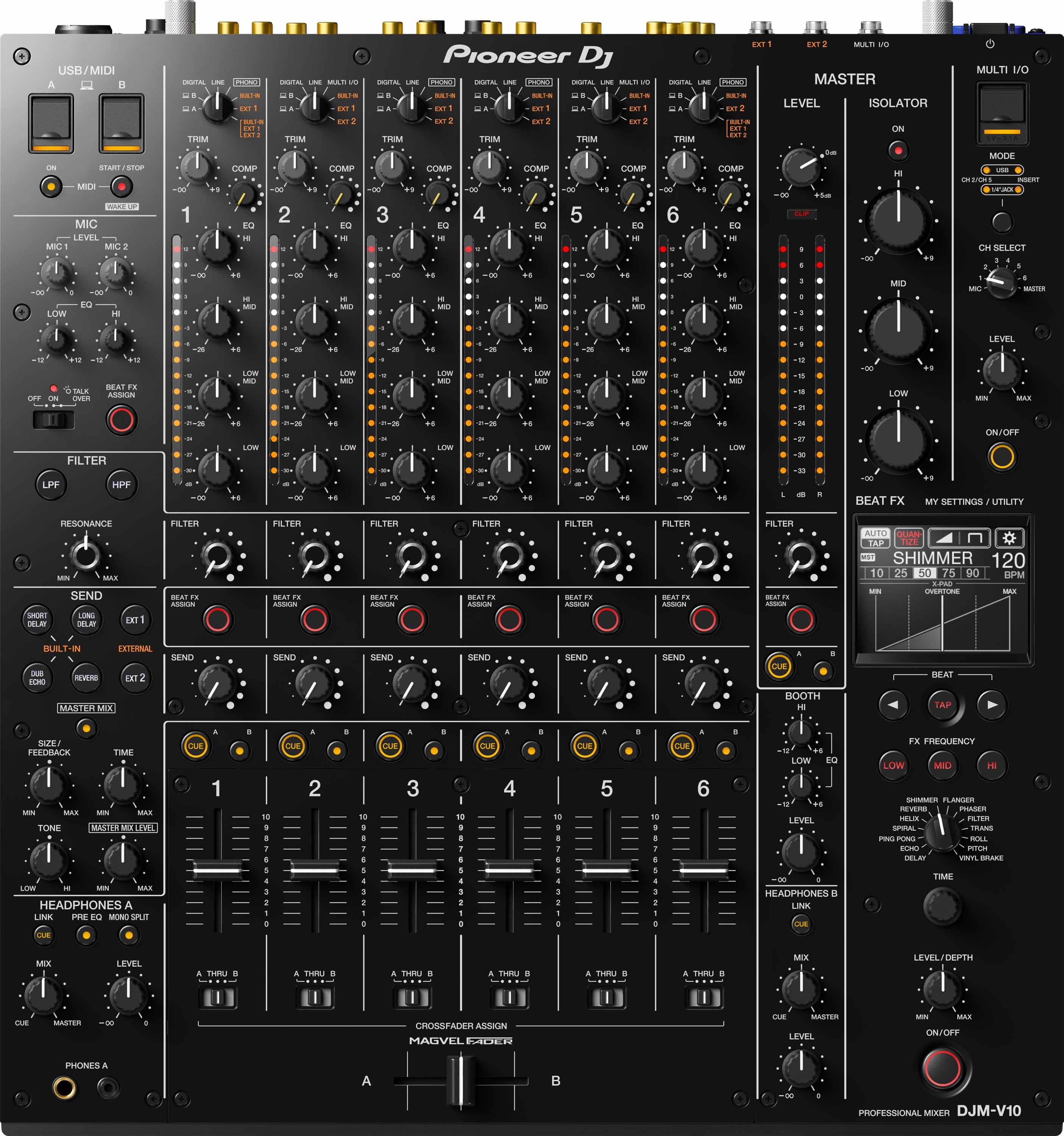 Pioneer DJ hat einen neuen Flagship-Mixer im Sortiment. Der DJM-V10 besitzt insgesamt sechs Kanäle, neue Effekte und Filter, Kompressoren, neue Möglichkeiten zum internen Re-Routing und einen Vierband-EQ.