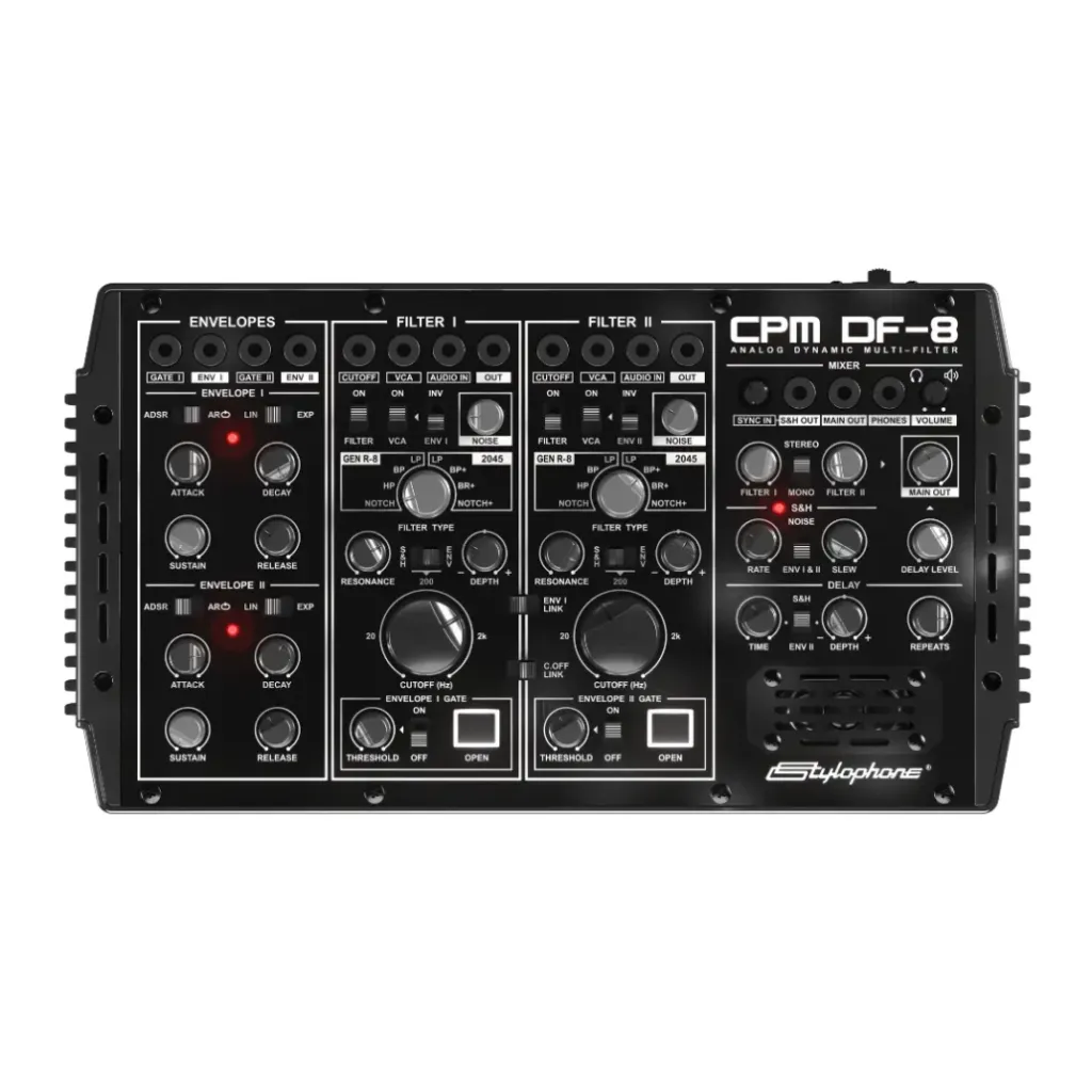CPM DF-8 ist ein Multimode Filter, der ebenfalls analog ist und als klare Ergänzung zum Drone Synthesizer gedacht ist. Im Kern besteht das Gerät aus zwei unabhängigen Filter-Einheiten, die komplett identisch aufgebaut sind. Beide besitzen sowohl einen Nachbau des SSM2045-Filters mit 24db Flankensteilheit, als auch einen analogen 12db Multimode-Filter, der auch schon im Dubreq Stylophone GEN-R8 verbaut wurde. Erster soll sanftere und runde Klänge erzeugen, während der GEN-R8 eher für raue Filtersounds steht. Beide Filtersektionen verfügen zudem über einen Audio-In als auch einen integrierten Noise Generator.