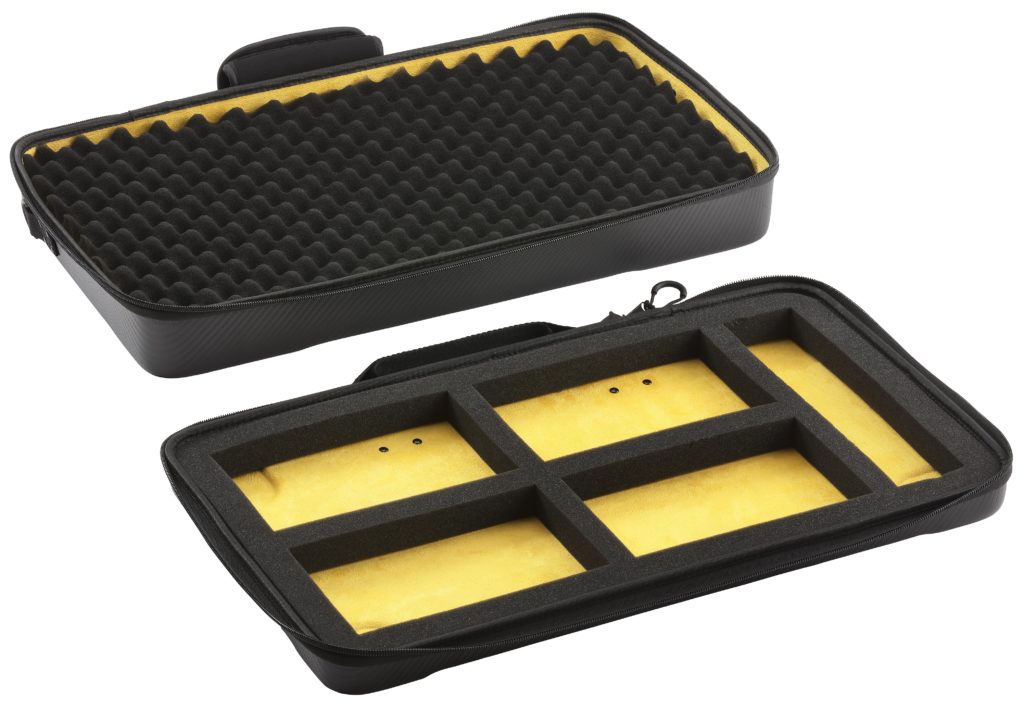 Eine Hülle aus Polyethylen Kunstharz sowie mit Schaumstoff gepolsterte Fächer schützen dabei die Volcas vor Erschütterungen beim Transport oder Staub und Schmutz im Studio-Einsatz. Praktisch ist auch, dass die kleinen Instrumente auch während einer Live-Darbietung fest im Case bleiben können, da sich die beiden Hauptseiten voneinander trennen lassen. Ein Tragegriff und ein mitgelieferter Gurt sollen für komfortable Mobilität sorgen.