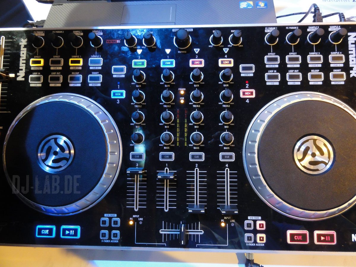 Mancher wird sich fragen, warum Numark einen Controller wie den N4 vorstellt. Numark hat doch bereits mit dem NS6 einen 4-Deck Controller im Sortiment. Schaut man sich den N4 genauer an, so wird man schnell merken, dass er von der Verarbeitung und dem Gewicht eher einem Mixtrack ähnelt. Somit ist klar, dass Numark hier einen 4-Deck Controller für Einsteiger präsentiert, den es in dieser Preisklasse nur von American Audio mit einem VMS-4 gibt. Auf der BPM-Show hatten wir die Gelegenheit uns den N4 genauer anzuschauen. Die Aufmachung des N4 wirkt im ersten Augenblick sehr vielversprechend, denn die glänzend schwarze Kunststoff-Oberfläche vermittelt den Eindruck von edlem Klavierlack oder ähnlichem (Es wirkt sexy). Die Bedienelemente sind übersichtlich, dem DJ-Workflow entsprechend angeordnet und fühlen sich griffig an. Die Jogwheels sind die gleichen wie vom Mixtrack. Sie reagieren gut im Zusammenspiel mit der mitgelieferten Software Serato DJ Intro und Virtual DJ 4Deck LE. Das Layout entspricht keiner prädestinierten Software, jedoch befinden sich genug Regler zur Effekt, Loop und Cuepunkt Ansteuerung auf dem Gerät. Über eine Shift-Taste kann man diese Funktion auch erweitert nutzen (Doppelbelegung). Alle Tasten sind beleuchtet. Eine Besonderheit auf der Oberfläche sind vielleicht noch die Crossfader Zuweisungstasten, die sich links und rechts von Crossfader befinden. Über die Shifttaste lassen sich hier auch Manöver in der Videosteuerung von Virtual DJ verrichten.