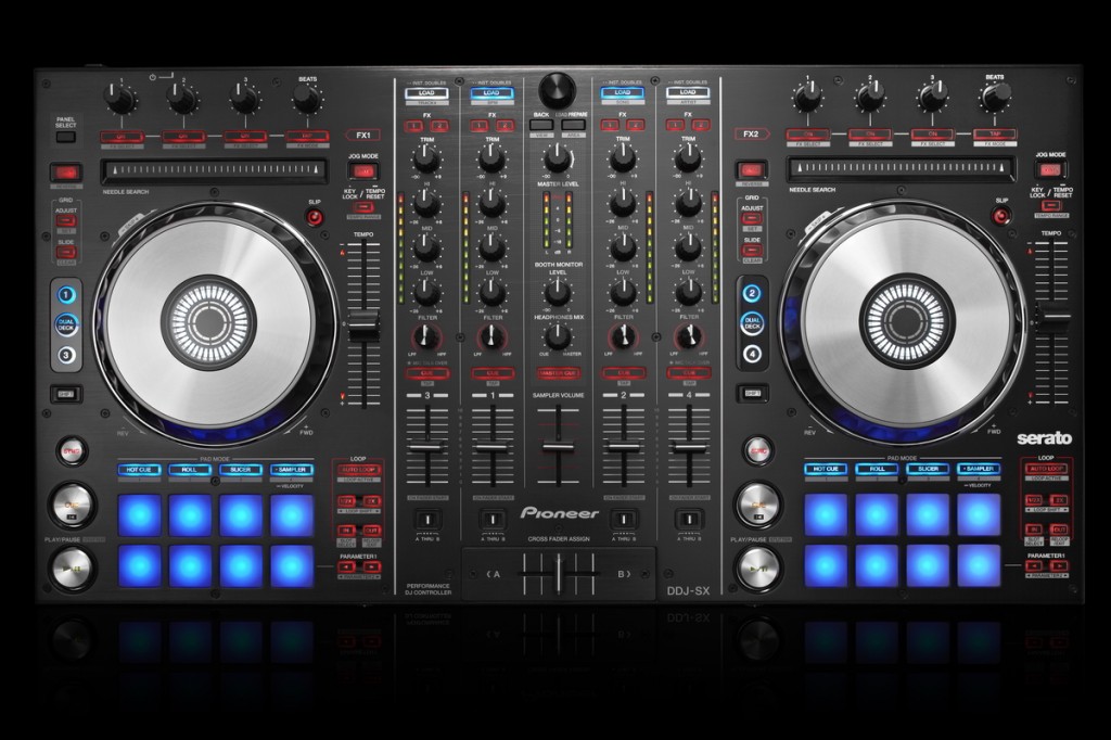 Der neue Pioneer DDJ-SX wird nicht nur der erste Controller sein, der mit der neuen Serato DJ Software funktionieren wird, sondern er wird aktuell auch als der neue Alles-Könner gehandelt. Im DDJ-SX wurde nämlich für fast jede schon bekannte Funktion ein Steuerelement verbaut, d.h. man kann wirklich von der eierlegenden Wollmilchsau sprechen. Der 4-Kanal Controller kann gleichzeitig als analoger Mixer arbeiten und birgt auf beiden Seiten große Kunststoff Jogwheels, wie man sie von den bekannten CDJ´s kennt. Dabei ist ein LED-Kranz in die Mitte eingelassen, der die Nadelposition des Tracks anzeigen soll. Die darunter liegenden Velocity Pads dienen zur Steuerung der Modi Hot Cue, Roll, Slicer und Sampler, so wie man sie bereits von Serato Itch mit dem Novation Twitch oder dem Vestax VCI-380 kennt. Die Loop Sektion beinhaltet Auto- und manuelle Loops.