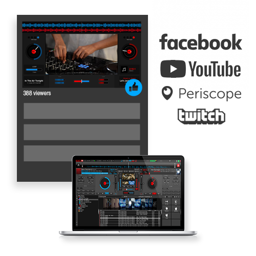Zeitgemäß: Die 2018er Version von Virtual DJ ermöglicht direktes und nahtloses Live-Streaming von Audio- und Videomaterial zu den beliebtesten Plattformen. Auf Facebook, YouTube, Periscope und Twitch können dabei auch diverse Videoskins, Grafiken oder auch eigene Logos zur Übertragung hinzugefügt werden.