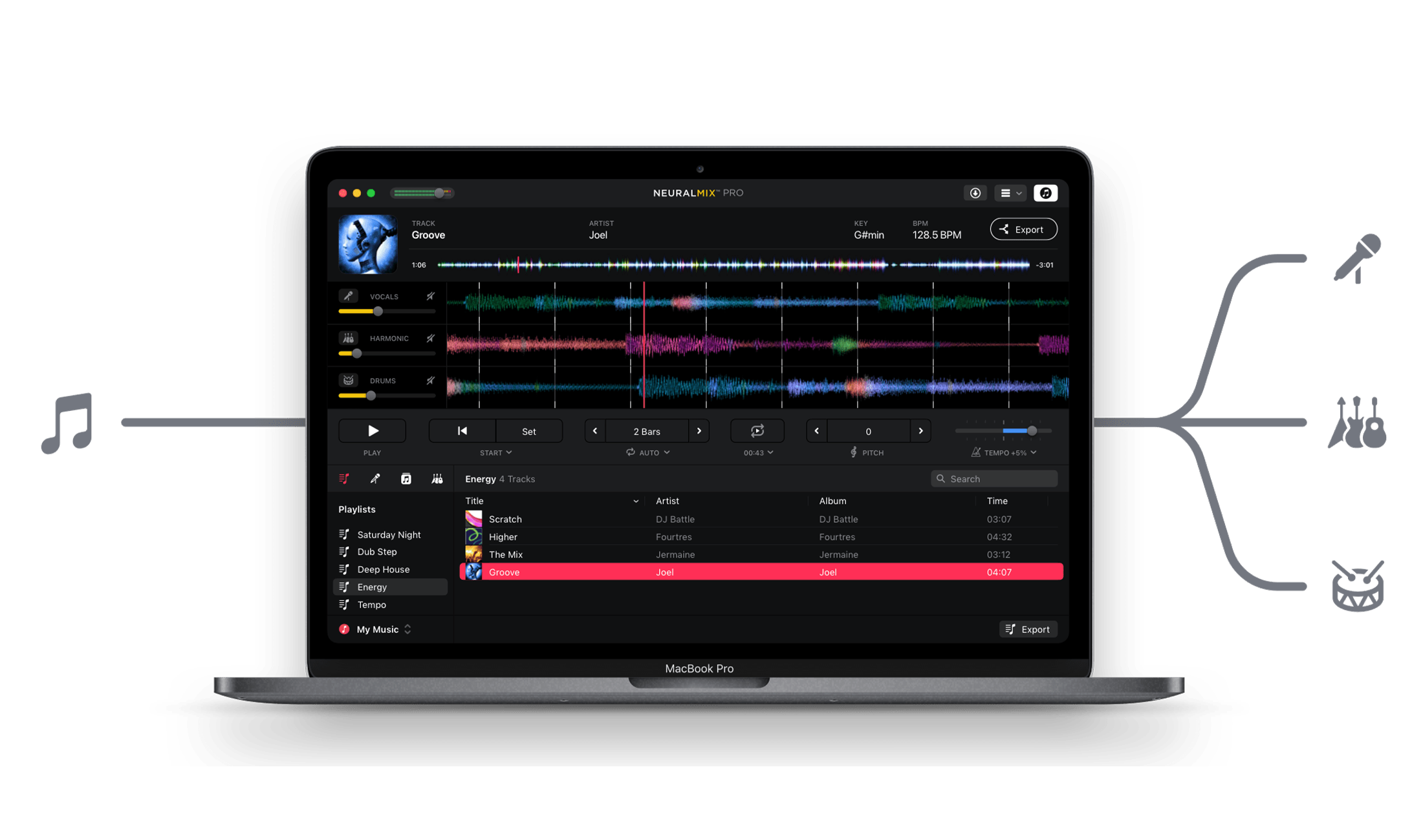 Neural Mix Pro erlaubt das Verändern der Geschwindigkeit, der Tonart sowie das Ein- und Ausblenden von Stems in Kombination mit dem Setzen von Loops in Echtzeit. Richtig spannend wird es aber erst durch die vielfältigen Exportmöglichkeiten, mit denen sich sehr einfach kreative Bausteine wie A Capella, Instrumentals etc. für Studioproduktionen, Remixe, Mashups oder DJ-Sets generieren lassen. Die exportierten Files können in eine DAW oder DJ-Software importiert oder natürlich auch für den Live-Einsatz auf einen mobilen Datenträger kopiert werden.