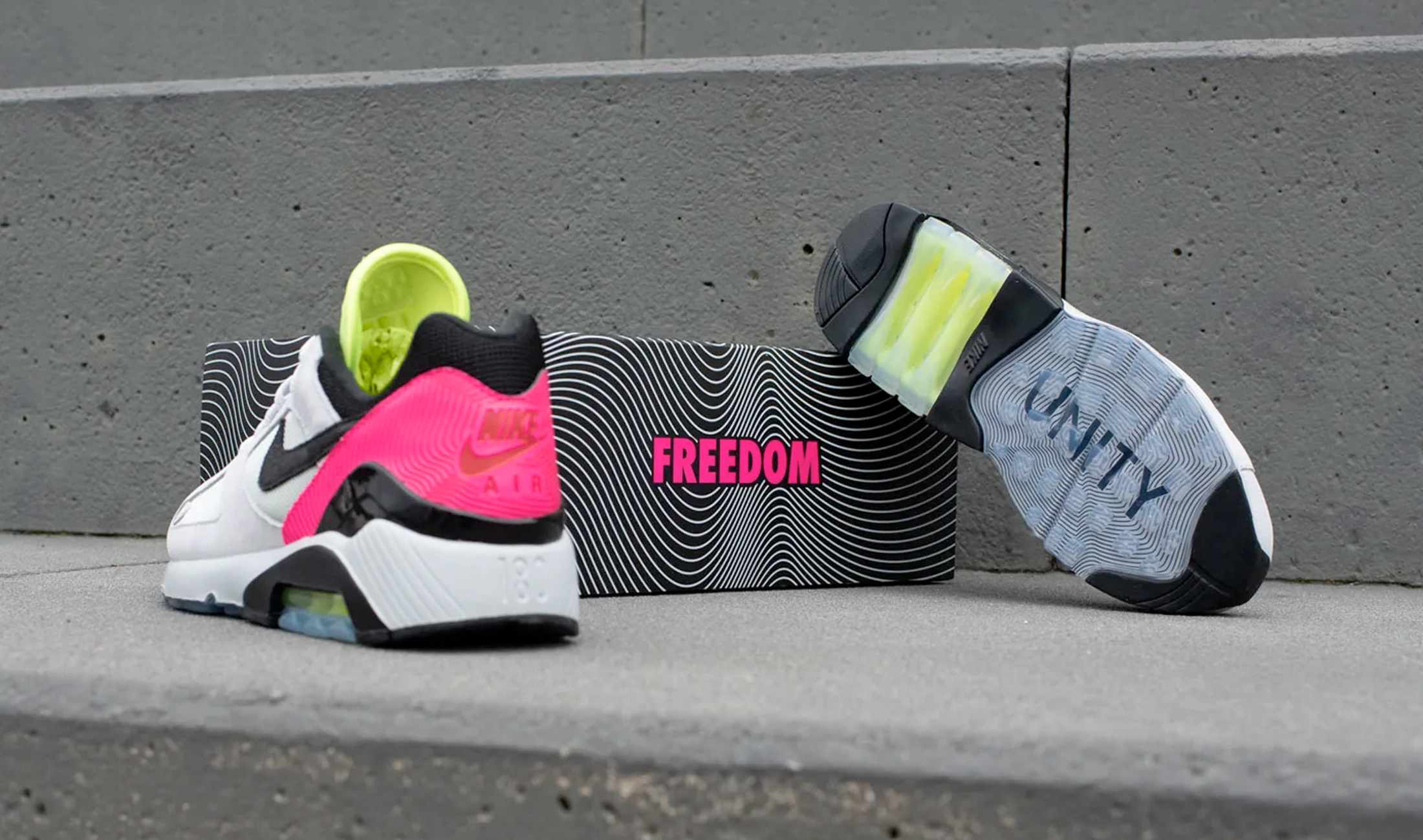 1991 brachte Nike erstmals den Air Max 180 auf den Markt. Der Schuh hat sich im Laufe der Jahre zu einem Klassiker entwickelt. Anfang der 90er sind Mauerfall und Wiedervereinigung ebenfalls noch recht frisch. In Berlin wird die neue Freiheit besonders mit der immer populärer werdenden Techno-Musik zelebriert. Für den Sporthersteller ergibt sich aus diesen Zusammenhängen nun die Neuveröffentlichung des Turnschuhs.