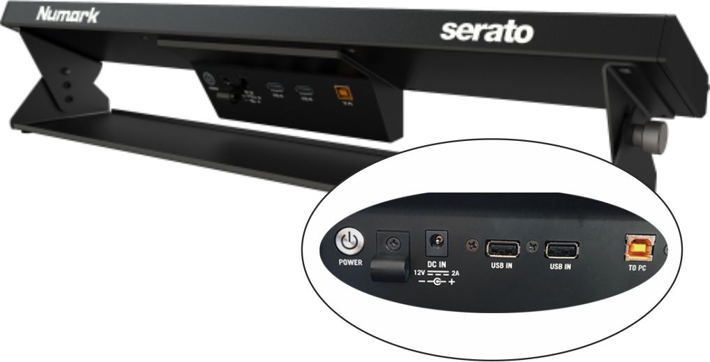 Numark-DashboardDas NUMARK DASHBOARD ist ein höhen- und neigungsverstellbares Gestell mit drei 4,3" LCD-Displays. Angeschlossen wird das über USB an den Rechner. Auf dem läuft noch immer SERATO DJ, allerdings kann er beiseite gestellt oder zugeklappt unter einen Tisch verbracht werden. Weitere USB-Geräte lassen sich über einen integrierten Hub verbinden.