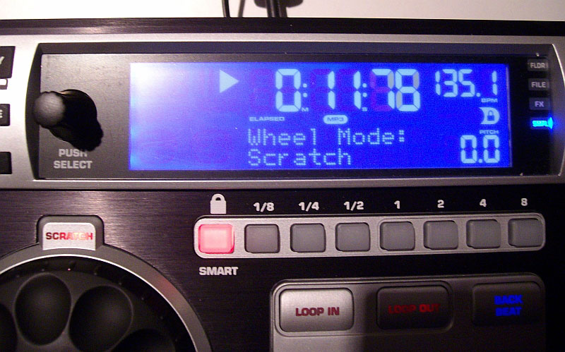 Auskunft über den laufenden Titel des jeweiligen Decks (Name, Zeit, Wiedergabesatus, BPM, Pitch) oder, wie auf dem Foto zu sehen, zum gewählten Jogwheel Modus, erhält man in einem einfachen Display. Grafische Extras, wie Waveform-Darstellung, gibt es nicht.