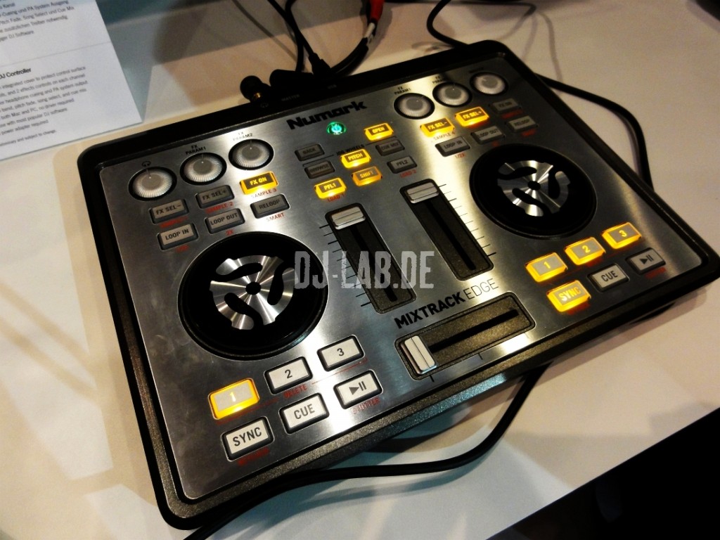 Flach wie eine Flunder, kaum größer als ein iPad und mit integriertem Audio-Interface: Das wären wohl die Hauptmerkmale für den neuen Numark Mixtrack Edge DJ-Controller, der kurz vor der Musikmesse 2013 in Frankfurt per Pressemitteilung angekündigt wurde. Die Bedienelemente des Edge zeigen kaum Höhe, so dass man beim Drüberfahren mit der Hand nicht aneckt. Hinzu kommt, dass der Controller ein Aluminium Faceplate besitzt und von einer Kunststoffabdeckung umhüllt ist, um ihn vor Transportschäden zu schützen. Schon mit dem DJ2Go hatte Numark einen ultrakompakten Controller vorgestellt, der den reisenden DJ begleiten soll. Ausgeliefert mit Virtual DJ LE und Algoriddim DJ hat der Mixtrack Edge gleich zwei Softwaretypen an Board, die den Einstieg Plug&Play ermöglichen sollten.
