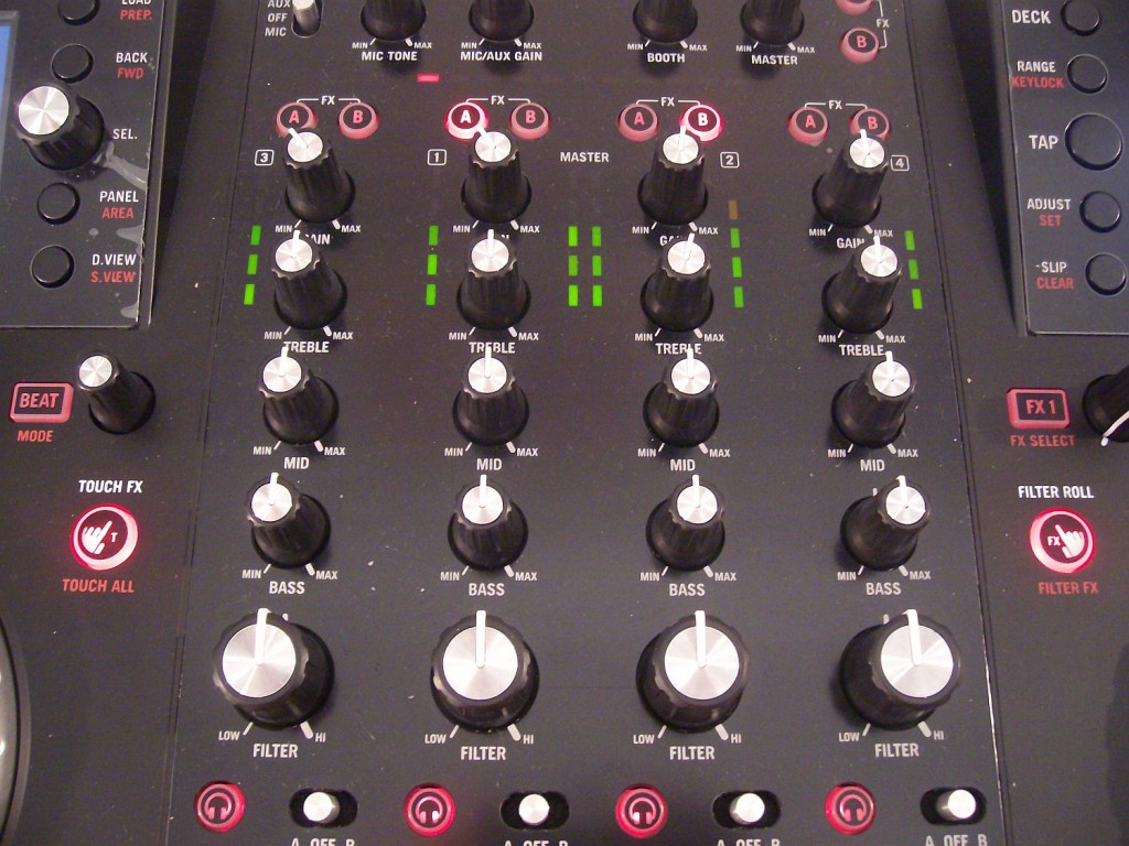 Den Fadern folgen die Wahlbuttons für das Vorhören und Zuweisung des Crossfaders. Jeder Kanal besitzt einen großen, bipolaren Filterknob, einen 3-Band-EQ mit kleineren Knobs und einen Gainregler. Haptisch einwandfrei, finden auch dicke Finger genügend Platz zum drehen und schrauben. Die 3-Band Klangreglung läßt sich temporär in einen "Touch Modus" schalten. Eine Berührung des Knobs aktiviert eine "Kill Funktion" im entsprechenden Frequenzbereich. Auch beim Filter sind Filter-Roll und -Effekte zuschaltbar. Zudem kann jedem Kanal eine der beiden Effekteinheiten der Software zugewiesen werden. In Summe ausreichend Potential für jegliche Art von Soundmanipulationen.