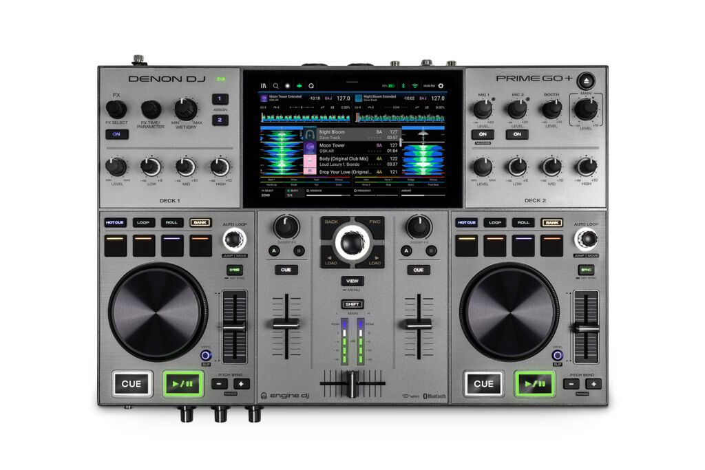 Der Denon DJ Prime Go+ lässt das mobile Konzept des Vorgängers unangetastet, ist aber durch das veränderte Farbdesign direkt als Neuzugang zu erkennen. Statt Schwarz dominiert nun Silber, die Bedienoberfläche, die sonstige Anordnung und Anzahl der Bedienelemente sind nahezu gleich geblieben, eine Slip-Mode-Funktion wurde ergänzt. Der Prime Go+ kann kabellos über Wi-Fi auf Streamingdienste zugreifen.