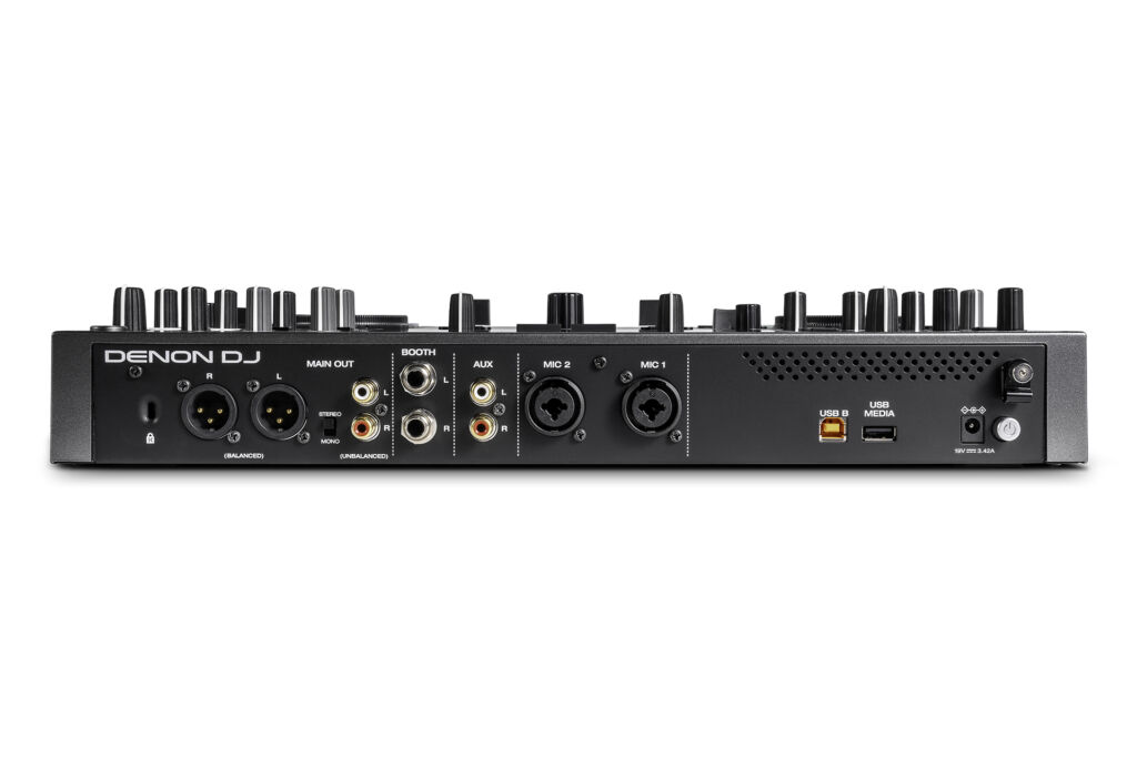 Das Standalone-Gerät kann bis zu vier Stunden ohne externe Stromversorgung betrieben werden (der Hersteller verspricht eine 25 % längere Laufzeit im Vergleich zum Vorgänger) und bietet neben symmetrischen XLR- und Cinch-Master-Ausgängen auch Klinkenbuchsen für das Booth-Signal. Zuspielungen sind über einen Cinch-Eingang und zwei Mikrofoneingänge möglich. Darüber hinaus verfügt der Denon DJ Prime Go+ über eine Bluetooth-Schnittstelle, die sowohl als Eingang als auch als Ausgang fungiert. Ein LAN-Port, wie er beim Vorgängermodell zur Verfügung stand, ist jedoch nicht mehr vorhanden.