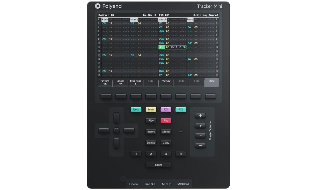 Der Tracker Mini richtet sich dabei an mobile Musikproduzent:innen und bietet mehr Funktionen als das Original, obwohl er kleiner und leichter ist. Er hat eine Stereo-Sample-Wiedergabe, ein eingebautes Mikrofon, USB-Audio und einen integrierten Akku. Er enthält 48 Instrumente mit 256 Patterns und 128 Steps pro Pattern. Dabei werden alle Patterns im vertikalen Spaltenformat wiedergegeben. Der Polyend Tracker Mini verfügt neben der Sample-Effekt-Sektion über eine Vielzahl von Kompositionswerkzeugen wie automatisches Pattern-Filling, Pro-Step-Effekte, Sample-Rolls sowie Batch- und globale Parameter-Editierung. Durch die Verwendung des Song-Arrangers können alle Patterns einfach zu einem vollständigen Stück zusammengestellt werden.