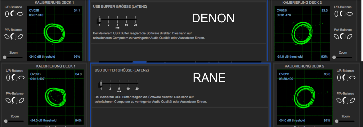 In der Software stehen sofort zwei Decks bereit. Es gibt keinen Unterschied zur GUI unter einer SL2-Box. SERATO DJ läuft wie gewohnt und das mit einer (testweisen) Latenz von 1ms. Ein kurzer Vergleich der Kalibrierungsanzeige zeigt keine markanten Differenzen.