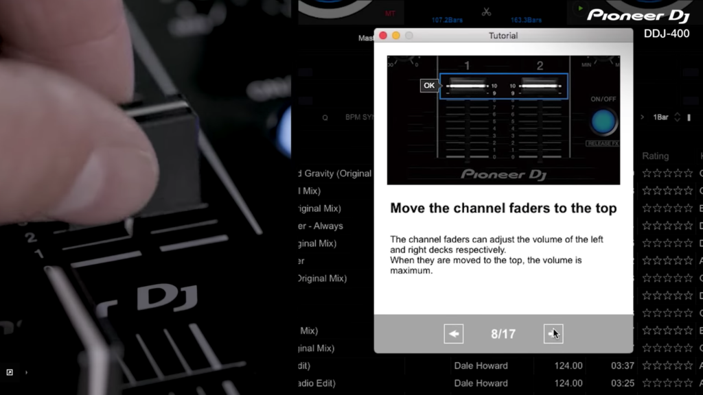 Eventuell ist dieses Feature dann aber für ganz frische Anfänger gedacht, die zu Beginn noch nicht mit der Notwendigkeit eigene Tracks auswählen zu müssen konfrontiert werden wollen. An sie richtet sich auch das eigentliche Highlight des Updates: Der Tutorial-Modus. Mit diesem (und einem geeigneten Controller – bis jetzt sind das nur der neue DDJ-400 und der DDJ-RB) kommen einzelne Videos, die den User Schritt für Schritt an die Techniken des Auflegens gewöhnen sollen. Das macht Sinn und scheint, wie für Pioneer typisch, hochwertig und intuitiv umgesetzt zu sein: