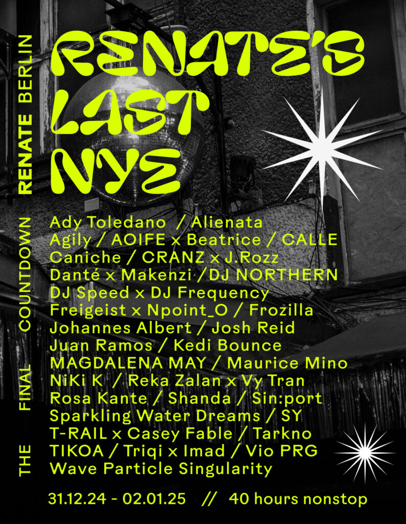 Bevor die Türen des Berliner Clubs 2025 schließen müssen, lädt die Renate zur 40 stündigen Silvesterparty ein. Auf diese Acts dürfen sich die Besucher:innen freuen.